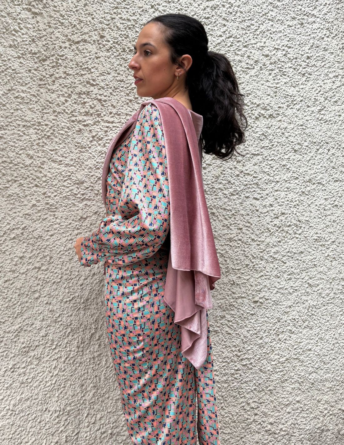 Capa corta de invitada en terciopelo color rosa con aberturas