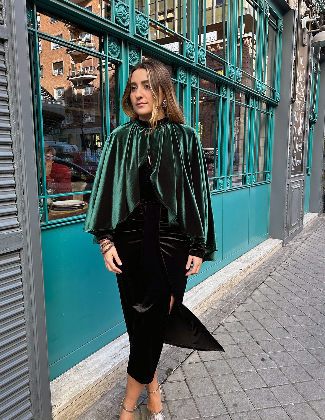 Capa de fiesta de terciopelo con abertura para invitada.