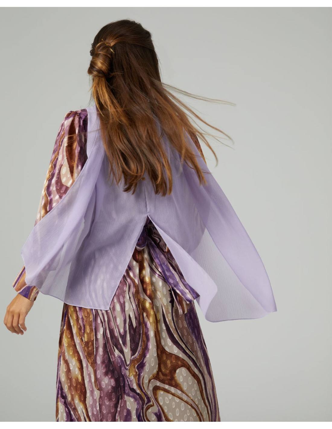Esta capa para invitadas se confecciona en una exquisita gasa catiónica color lila, un tejido conocido por su caída suave y fluida, ofreciendo una textura fina y agradable al tacto. Este material tiene la capacidad de cambiar de tonalidad según la luz, lo que aporta un efecto visual dinámico y atractivo, dando vida y movimiento a tu conjunto de invitada perfecta.