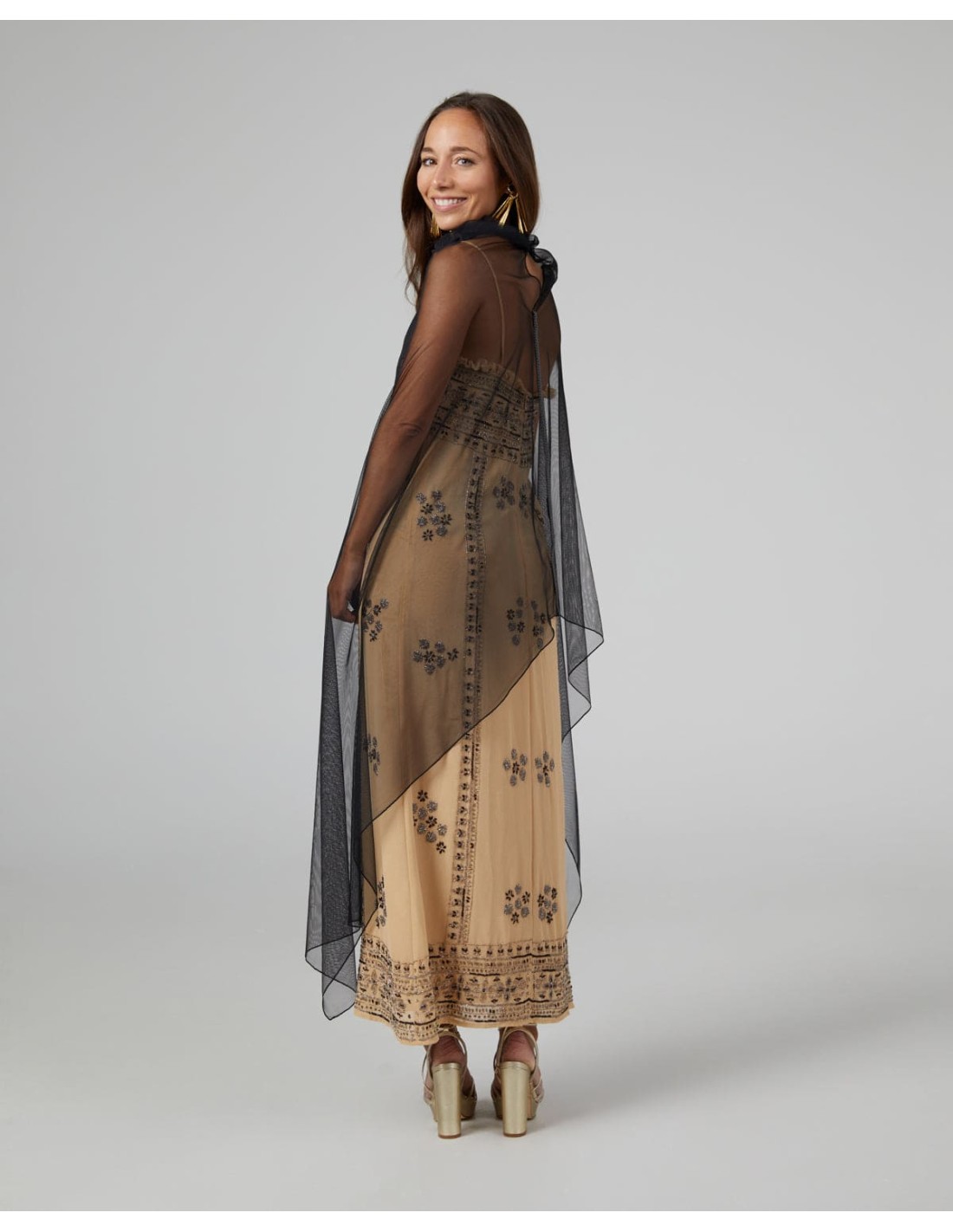 Capa de fiesta larga en tul negro con aberturas laterales para invitadas, madrinas y ocasiones especiales.