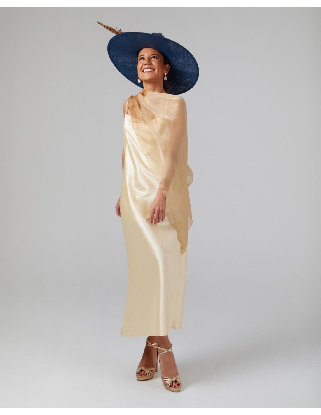 Esta capa para invitadas se confecciona en una delicada gasa catiónica de doble hilo ligera y vaporosa en color dorado. Presenta un corte fluido y asimétrico que se extiende suavemente sobre los hombros y los brazos, cayendo elegantemente alrededor del cuerpo.
