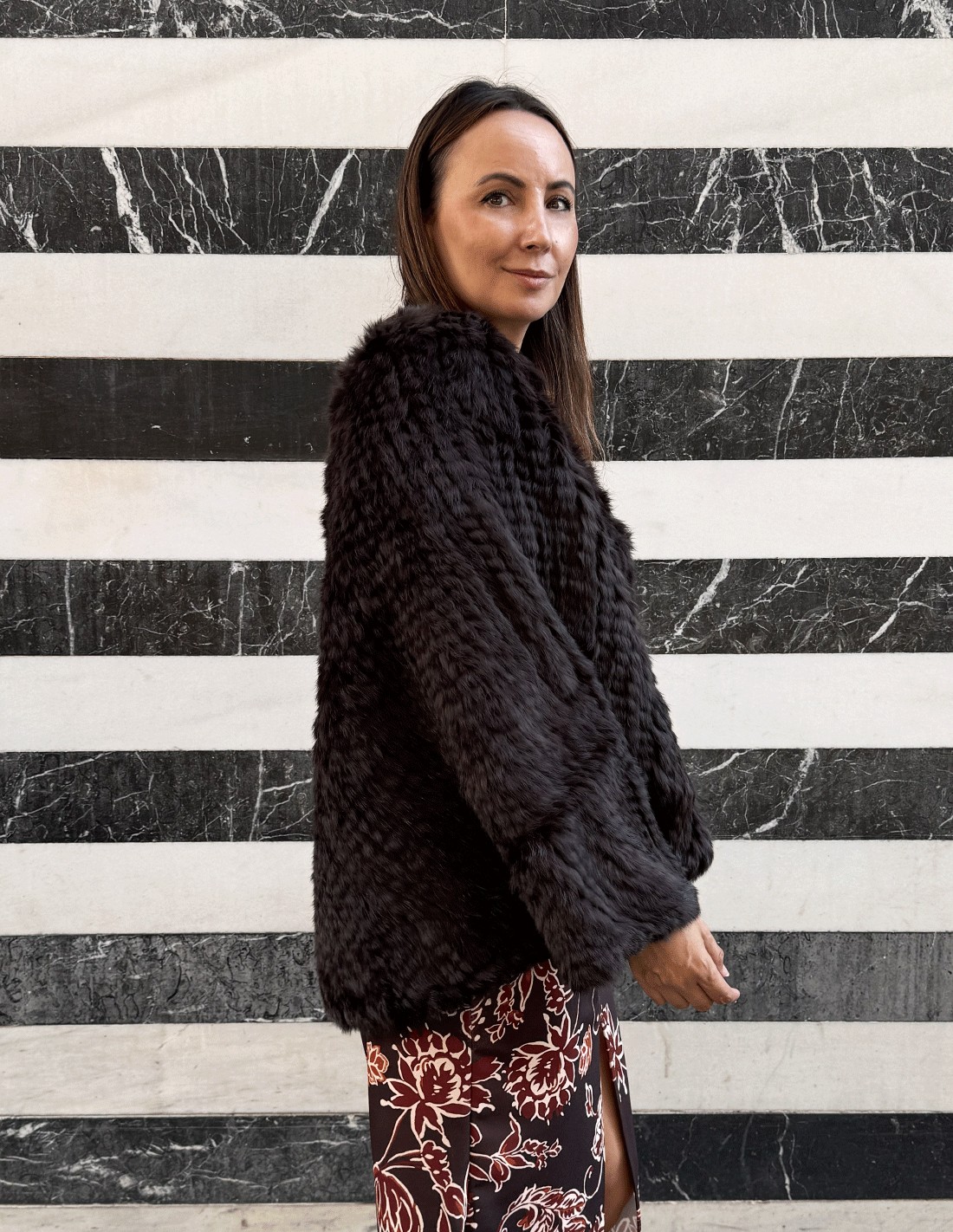 Cuando te la colocas, notas de inmediato la suavidad del pelo de conejo y la ligereza del corte, que envuelve sin recargar.