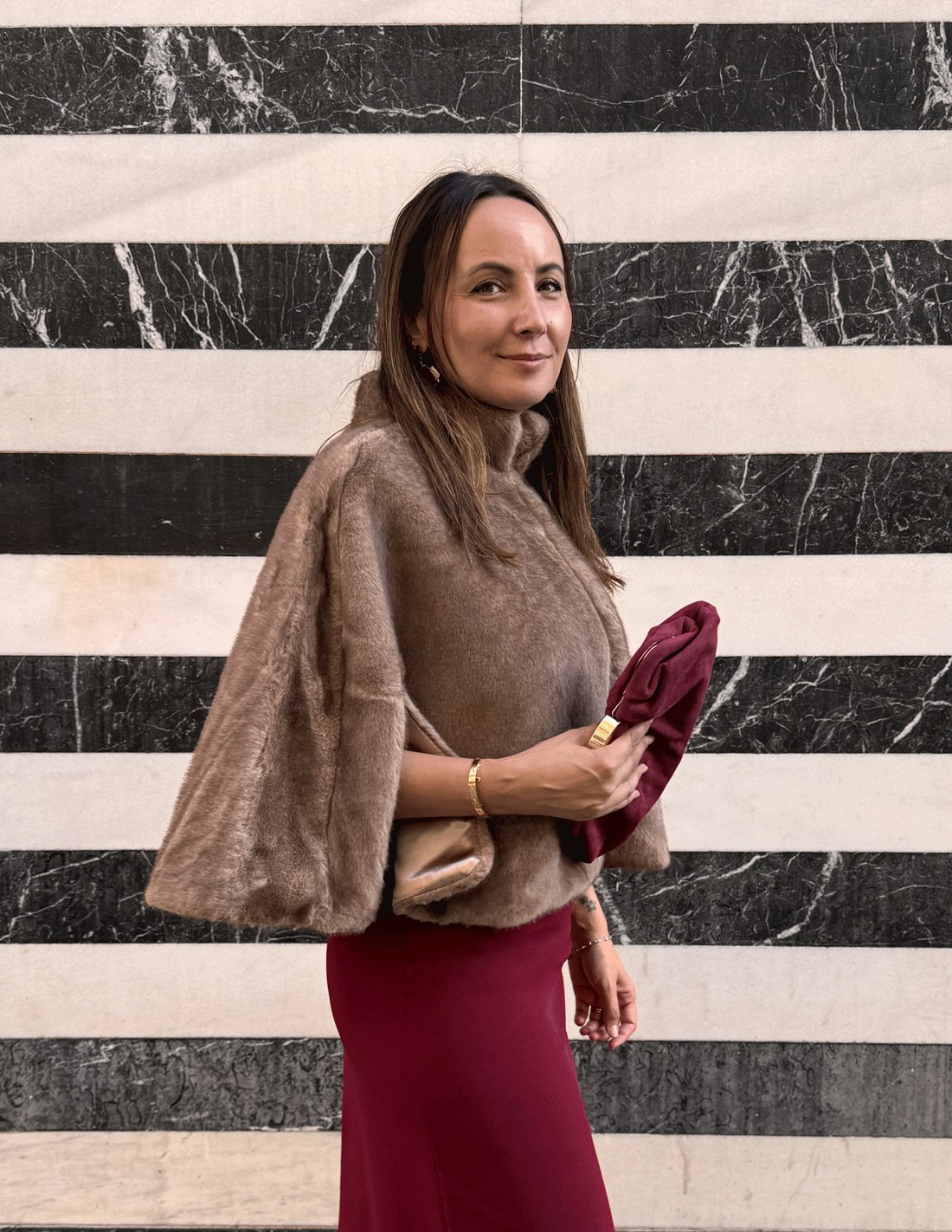 Esta Capa de pelo sintético marrón ha sido diseñada pensando en la mujer que busca una prenda versátil, duradera y con estilo. Quería algo que pudieras llevar tanto encima de un vestido de invitada en una boda como sobre una camisa o un abrigo en una cena elegante. El resultado es una pieza atemporal que aporta sofisticación inmediata sin perder calidez ni comodidad.