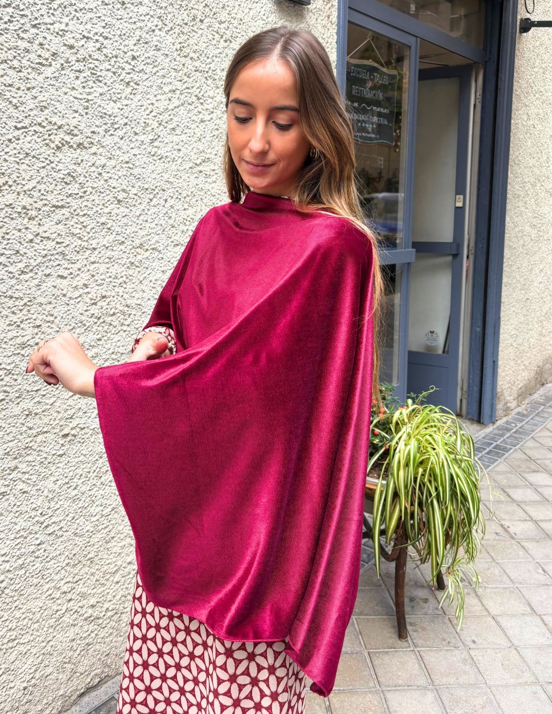 Si tienes tu look de invitada para tu próximo evento pero te falta ese toque final que le da estilo y originalidad, esta capa de invitada es el complemento ideal para elevar cualquier vestido o conjunto. Una capa de invitada confeccionada en tejido de terciopelo de alta calidad en color granate, con detalle de aberturas laterales dándole un toque elegante y de estilo.