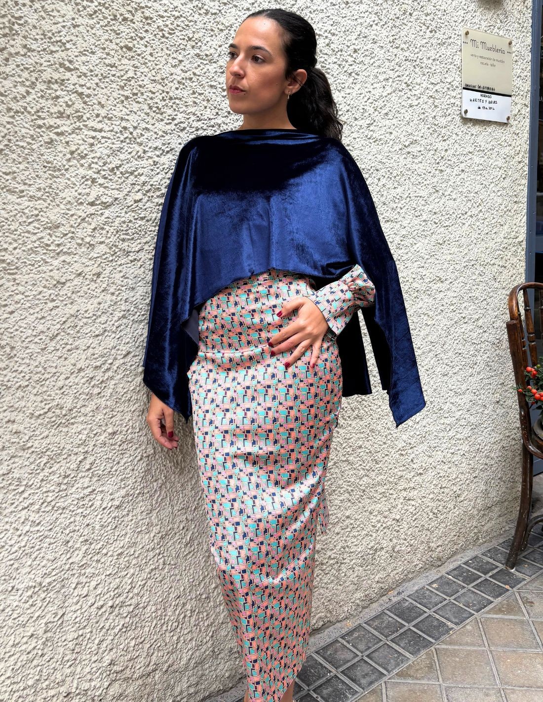 Si ya tienes tu look de invitada para tu próximo evento y quieres elevarlo al máximo nivel, los complementos siempre son la clave. Completa tu look con esta capa de invitada en tejido de terciopelo de alta calidad, en color azul marino, con detalle de aberturas en los laterales. Ideal para cualquier evento especial ya sean bodas o incluso graduaciones, combínala también con looks casual.