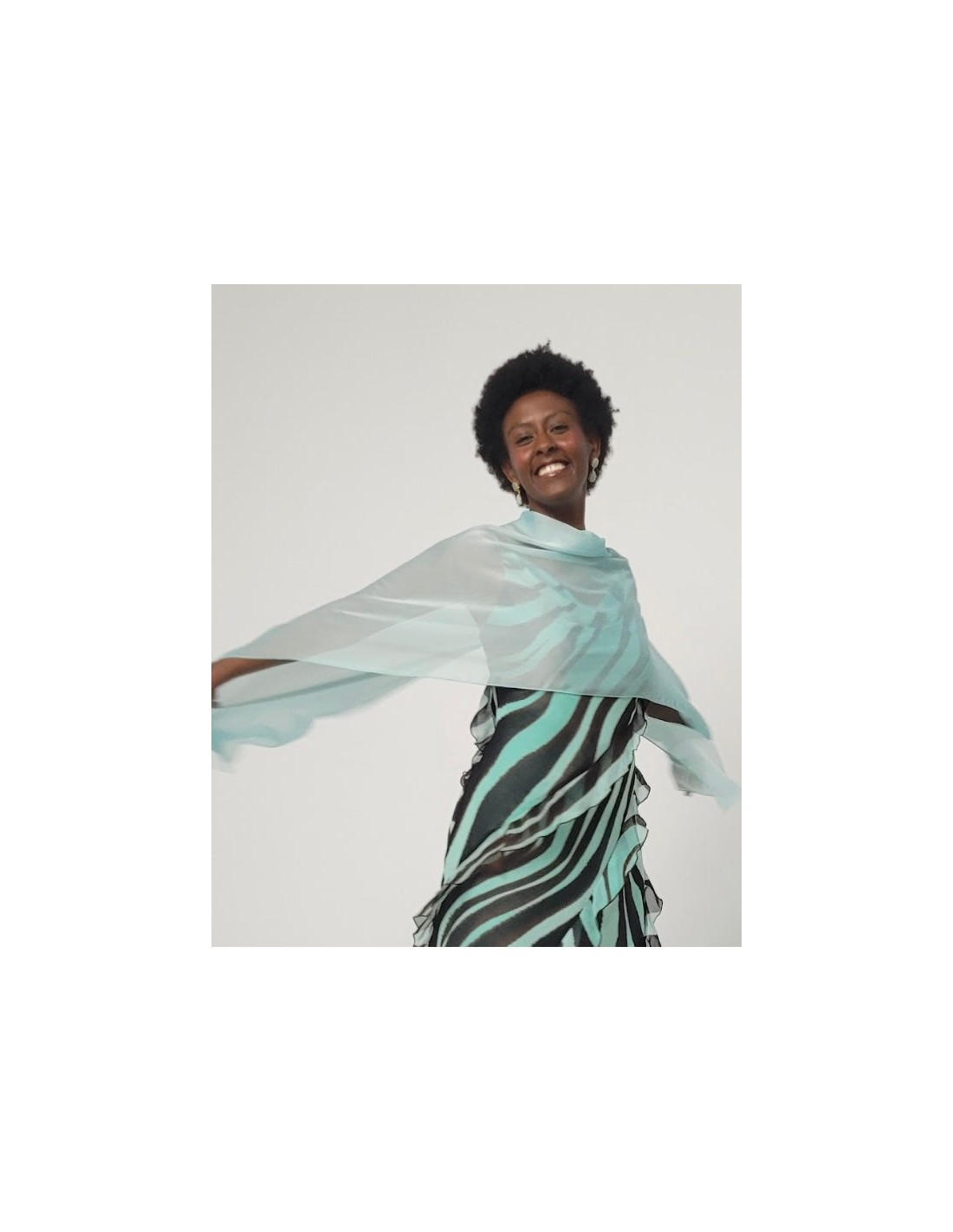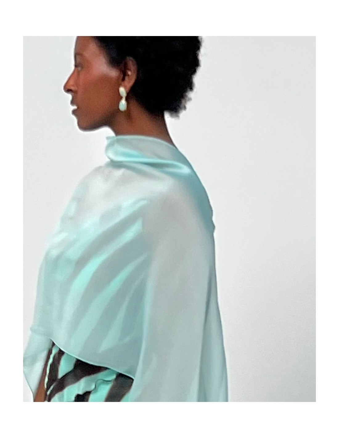 Eleva tu look con un complemento que aporte ese toque de estilo que le falta a tu look de invitada, como esta capa de gasa en color azul aguamarina, ideal si no quieres llevar los hombros descubiertos o quieres taparte del frío.