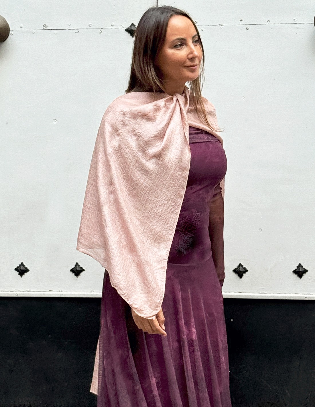 Un chal confeccionado en textura satinada en tejido con toques brillantes, el complemento ideal si deseas darle un toque de estilo y elegancia a tu look de invitada para tu próximo evento de otoño o invierno. Perfecto para tapar los hombros en la iglesia, para abrigarte del frío si tienes una boda de otoño o invierno o incluso para darle un toque diferencial a tu vestido.