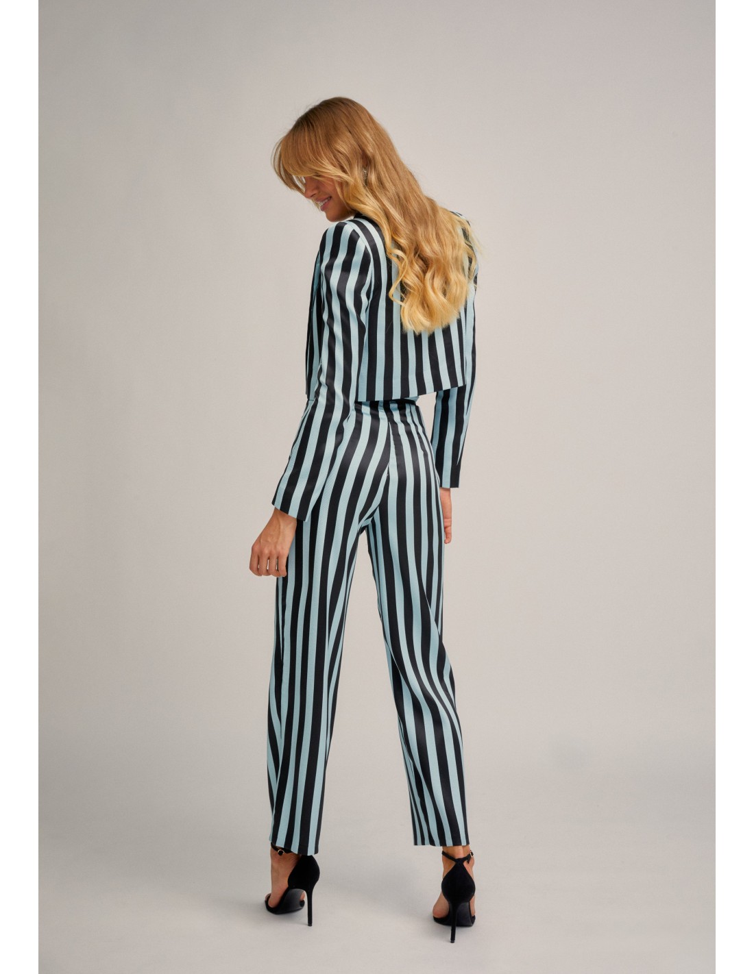 Chaqueta sastre de rayas negro y celeste con cuello smoking para invitadas