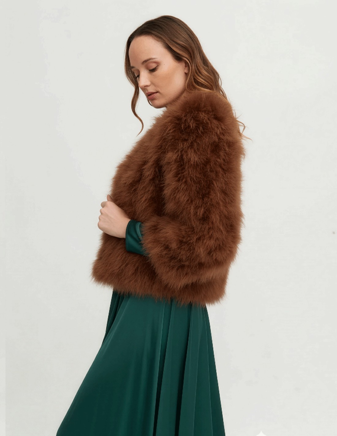 Chaqueta de pluma de avestruz marrón para invitada boda y evento - chaqueta de piel marrón