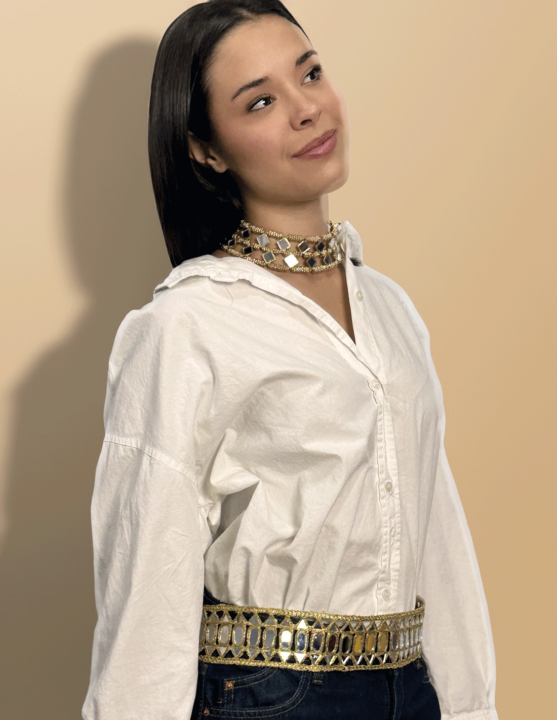 Transforma cualquier look con un toque artesanal y de estilo con nuestro cinturón ancho con espejitos ajustable. Diseñado para resaltar la cintura y añadir un toque especial. Sus pequeños espejitos decorativos aportan un toque único y original a cualquier look, ya sea para verano como otoño o invierno, combínalos con looks sencillos y de tejidos lisos y dale un toque elegante para cualquier ocasión especial, incluso para eventos de navidad.