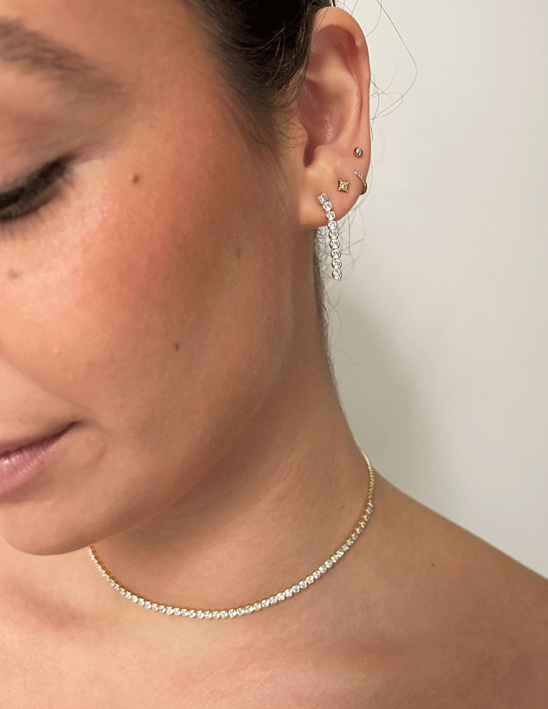 Impresionante choker hecho a mano con circonitas brillantes y elegante baño de oro, terminado con dos delicadas perlas para un toque extra de sofisticación. Su diseño ajustable permite usarlo como collar o gargantilla, adaptándose a cualquier estilo. Este choker ilumina el rostro y es la elección perfecta para las amantes de la moda que buscan una pieza versátil y lujosa. ¡Un accesorio atemporal que realzará cualquier look!