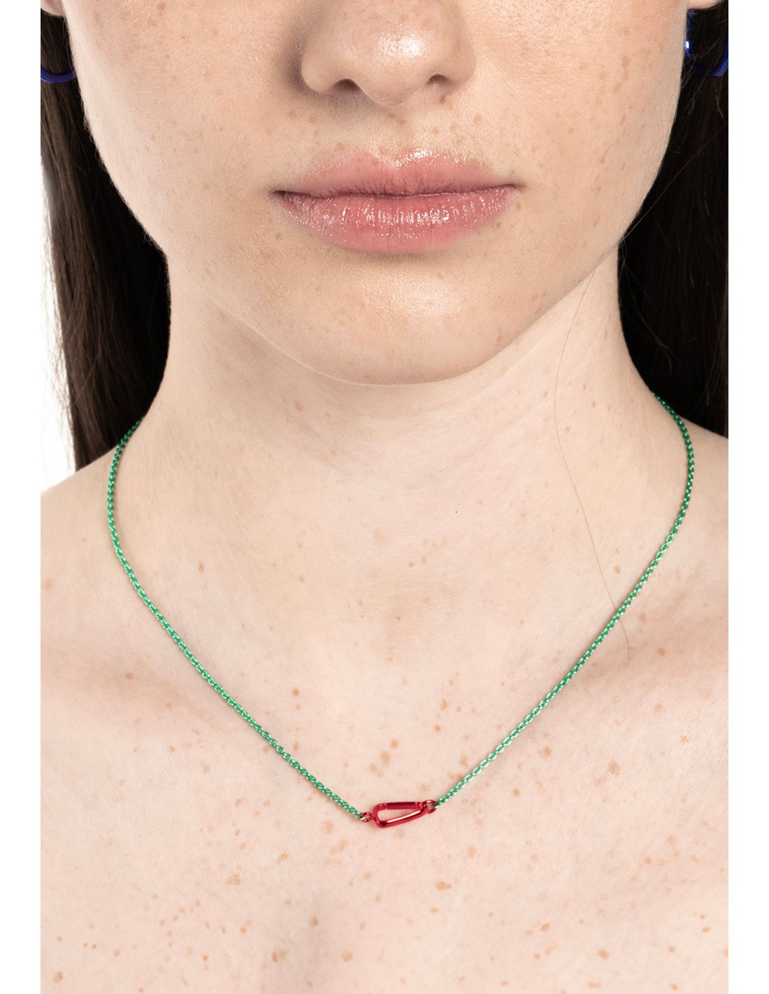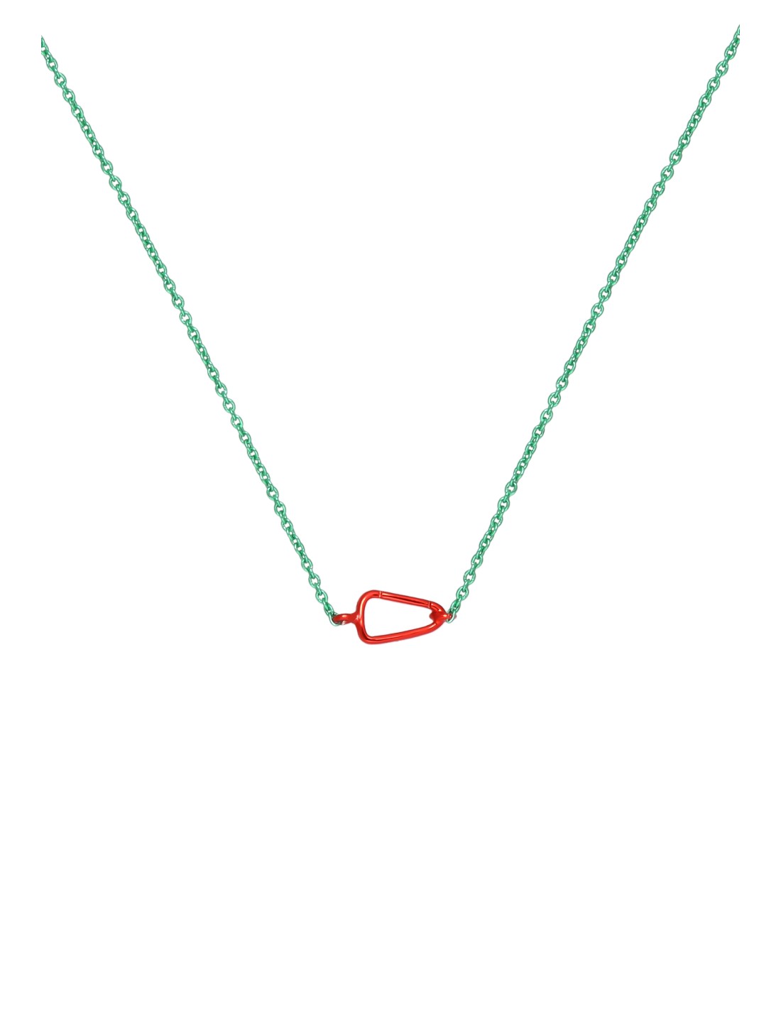 Este colgante mosquetón rojo y verde fusiona elegancia y tecnología. Con una cadena verde y un mosquetón rojo, con un acabado en baño electrolítico flúor, un colgante futurista que le dará un toque de color a cualquier look, ya sea para eventos como para el día a día.