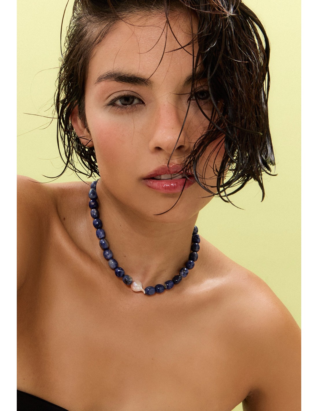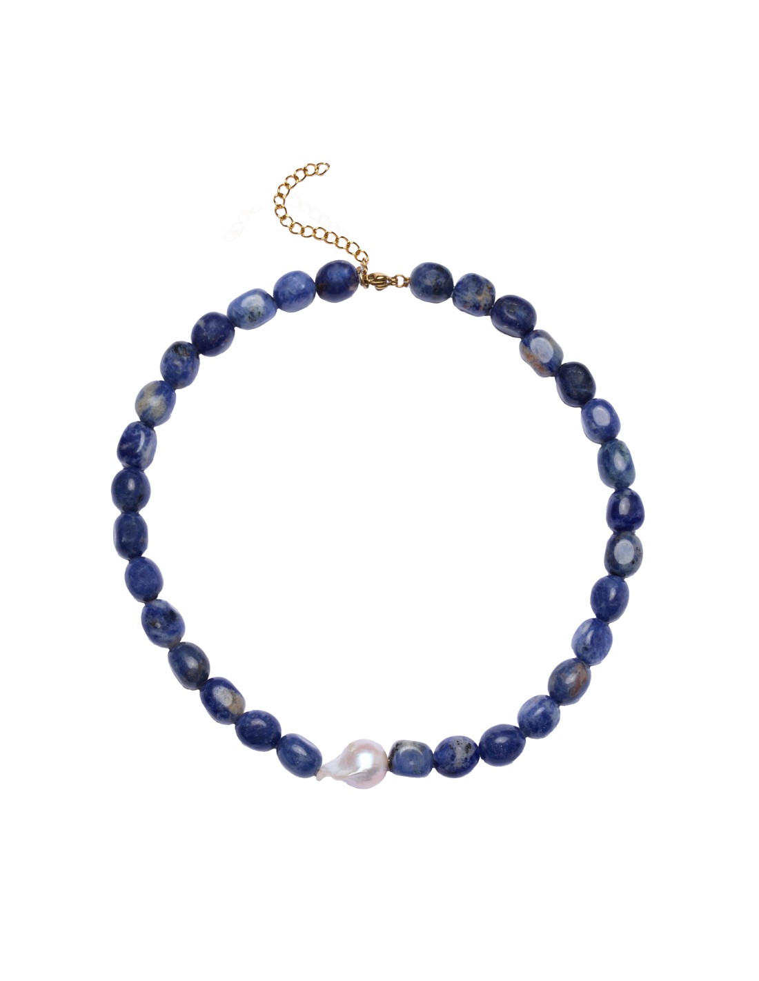 Si buscas un complemento que haga llevar tu look al máximo y marque la diferencia, este collar de piedras azules será un acierto seguro. Un collar de piedras sodalita con un detalle de perla barroca en el medio, y un acabado en baño de oro de 22k. Ideal para darle un toque de estilo y originalidad a cualquier look.