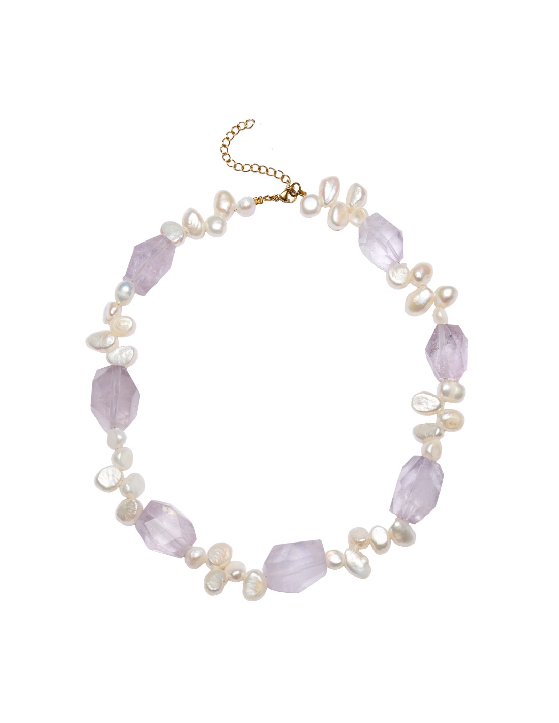 Dale un toque de luz y estilo a tu look para cualquier evento con un complemento que destaque como este collar de piedras. Un collar a modo gargantilla confeccionado con piedras semipreciosas amatistas y perlas barrocas alternadas, con un acabado en baño de oro de 22k. Ideal para cualquier ocasión especial.