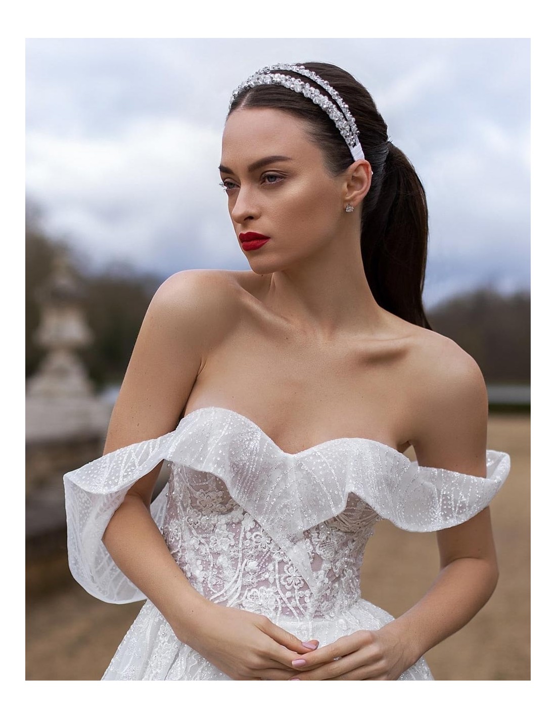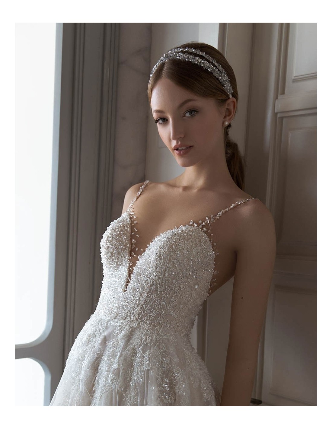 Su diseño versátil permite llevarla como accesorio principal o acompañada de un velo, logrando un look glamuroso sin sobrecargar el estilismo. Es la elección perfecta para novias que desean destacar con un complemento exclusivo y refinado.