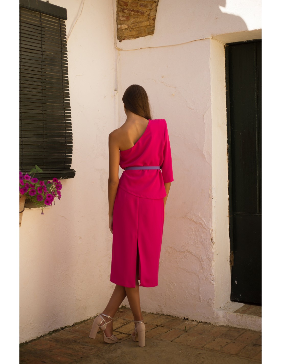 Conjunto de fiesta con top de de fiesta y falda recta color fucsia.