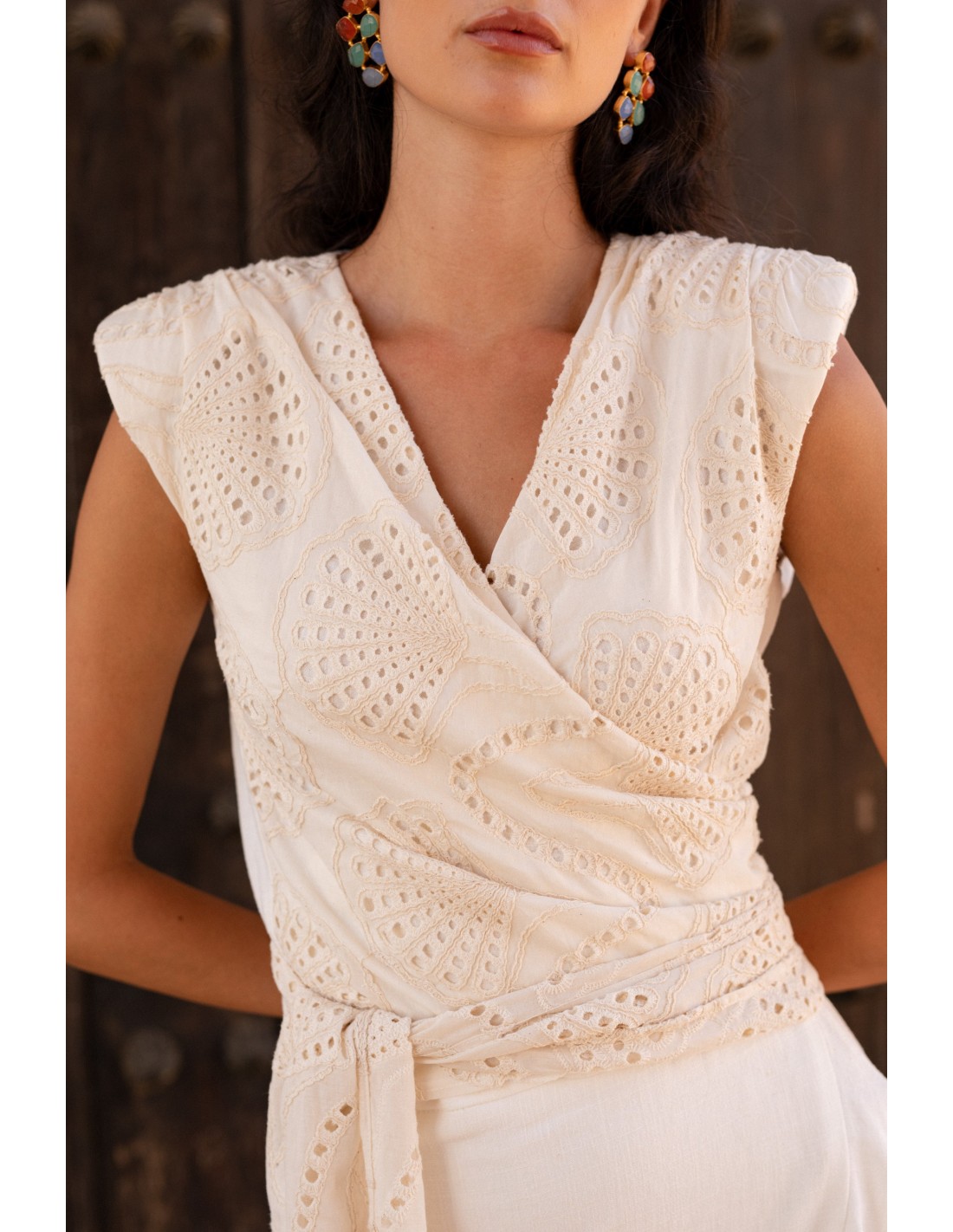 Este conjunto mamá comunión en lino blanco es la elección ideal para quienes buscan estilo y frescura durante los días más cálidos. El top sin mangas con hombreras presenta un favorecedor escote en V con cruce frontal que termina en una delicada lazada a la cintura, aportando un toque femenino y estilizado.