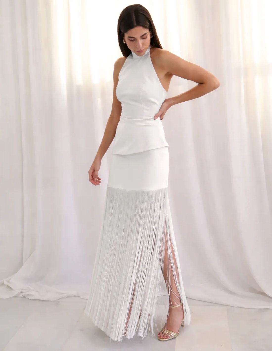 Conjunto dos piezas blanco con top halter estructurado y falda midi con elegantes flecos que aportan movimiento.