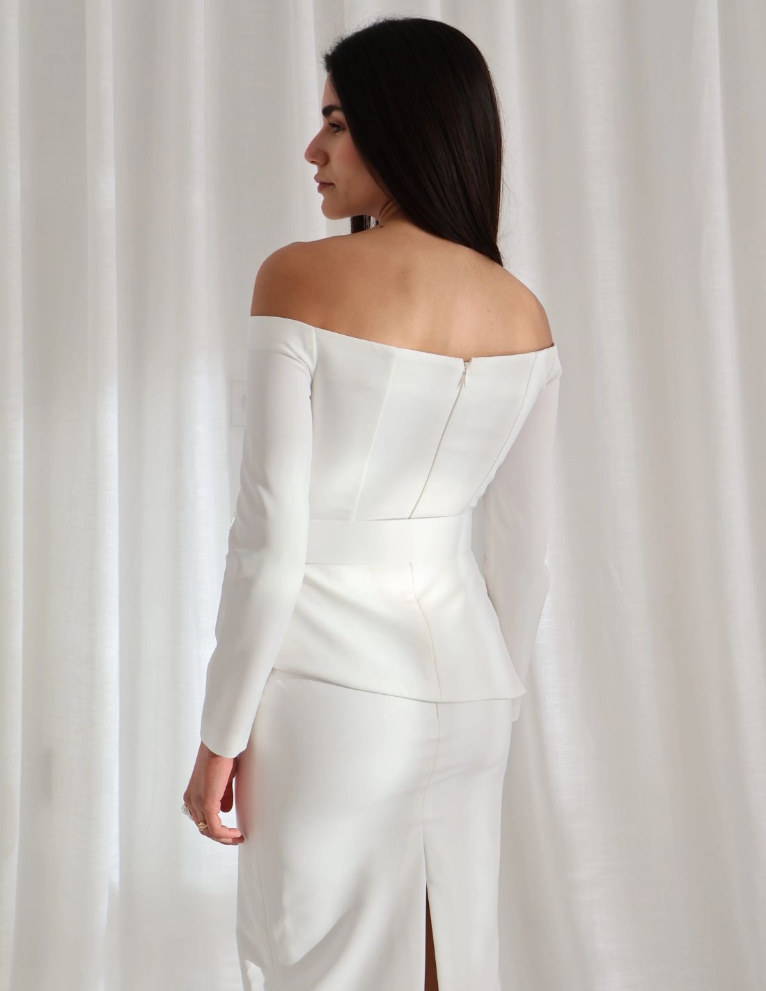 Este set de dos piezas te hará ser la invitada perfecta. Confeccionado en tejido de crepe color verde pistacho, con top de escote bardot y manga larga. Además, incorpora falda midi con abertura. Sin duda, un conjunto ideal para eventos de primavera. Incluye también un cinturón del mismo tejido y color, que le da el toque elegante y favorece muchísimo al diseño.