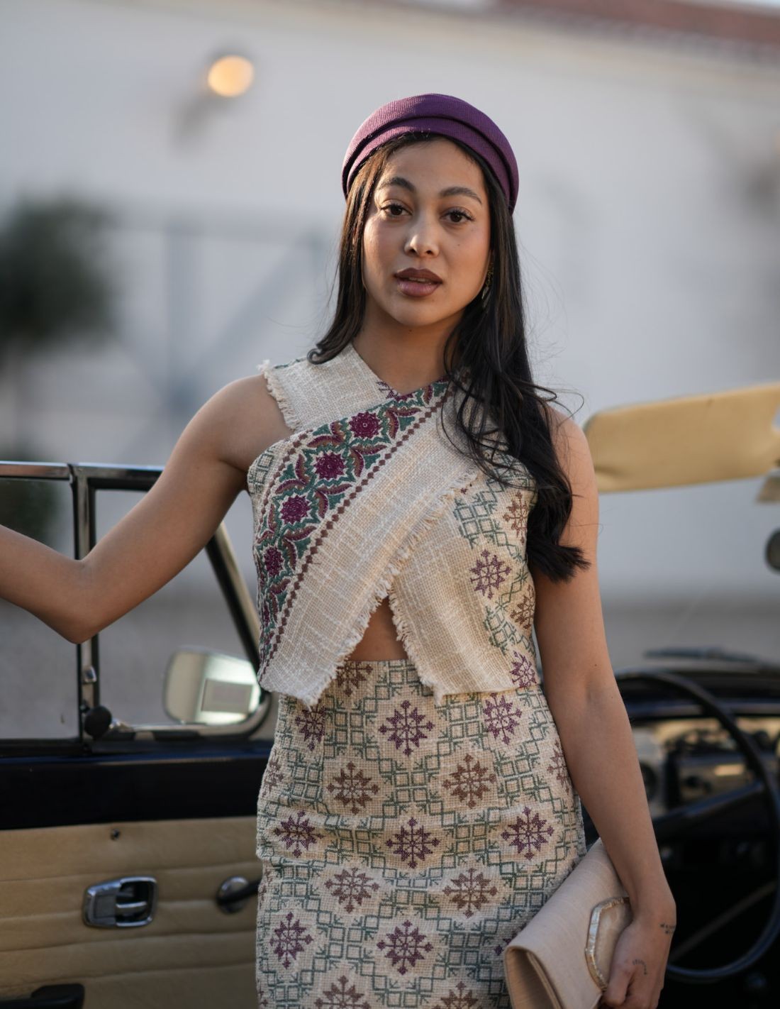 Conjunto para invitada en tejido rústico con estampado geométrico perfecto para eventos de primavera.
