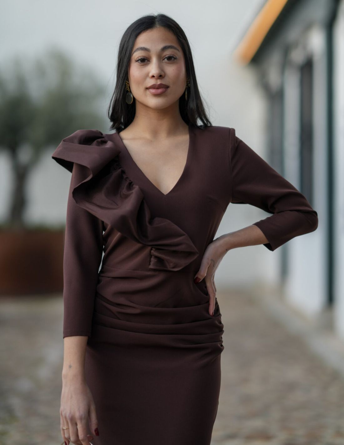 El diseño presenta un favorecedor escote en pico y un llamativo detalle de volante estructurado en el hombro, que aporta volumen y un toque distintivo al conjunto. Los drapeados laterales en la cintura estilizan la figura y crean una silueta elegante y armoniosa. Su largo midi y mangas al codo lo convierten en una prenda versátil y muy favorecedora, ideal para bodas, eventos o celebraciones especiales. El tono marrón aporta sobriedad y sofisticación, permitiendo combinarlo fácilmente con accesorios dorados o tonos neutros.