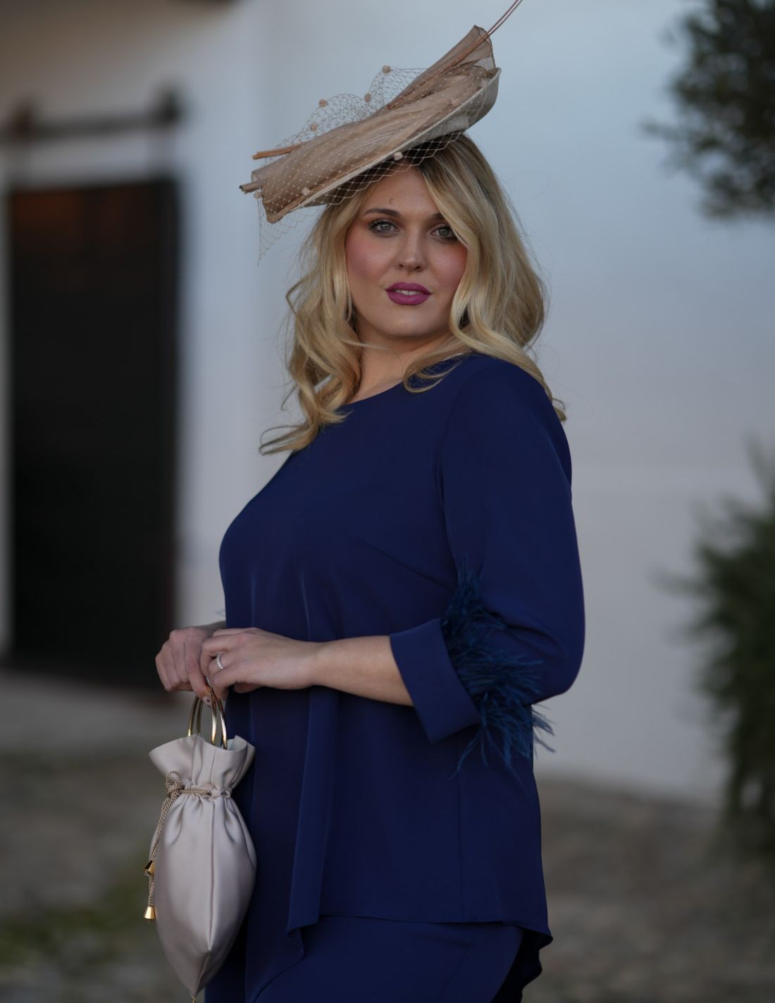 Si quieres lucir espectacular pero no te apetece recurrir al vestido, este conjunto de invitada te hará brillar. Diseñado con un blusón fluido con manga francesa y detalle de plumas en los puños. En la parte del escote, un detalle de lágrima, sutil y elegante. La parte de abajo, un pantalón con linea recta, muy favorecedor. Ambas piezas en color marino, elegante y sofisticado que podrás lucir en casi cualquier temporada del año. Ideal para boda, comunión, bautizo...