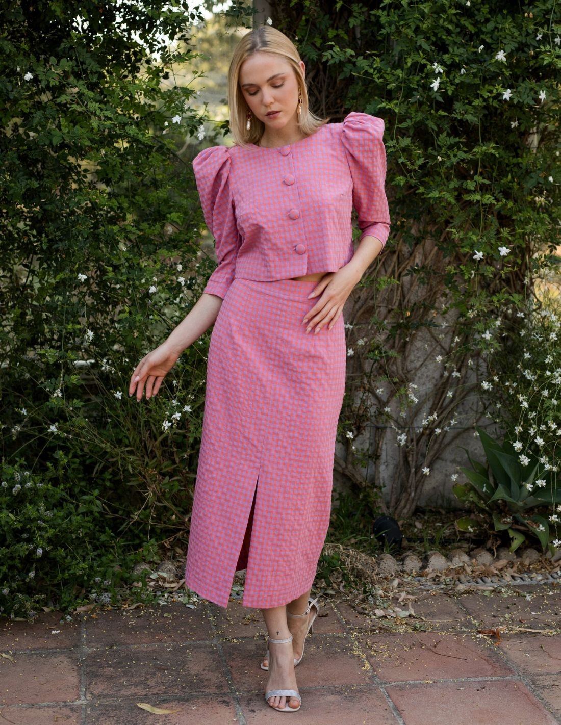 Conjunto de dos piezas en vichy rosa con chaqueta de mangas abullonadas y falda midi
