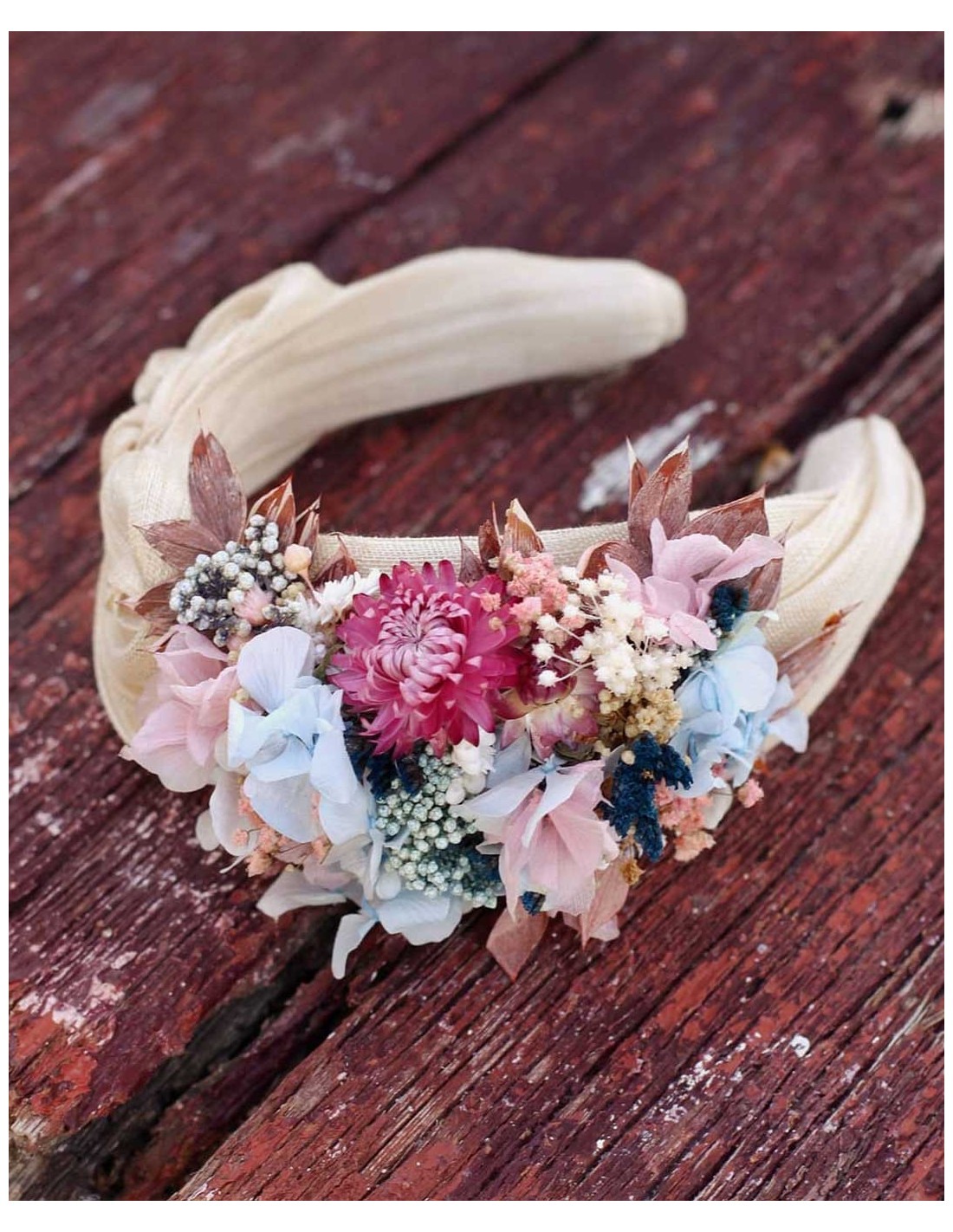Preciosa diadema cruda arrugada de sinamay con flores preservadas para invitadas de mañana.