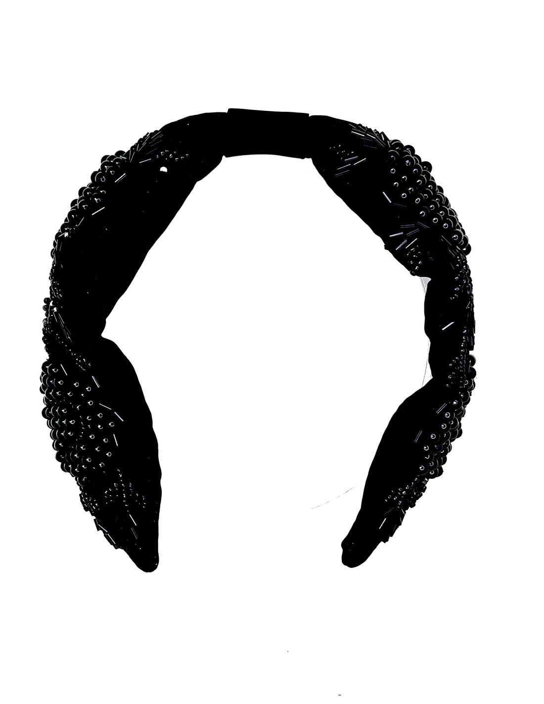 Una diadema de invitada de color negro intenso con pedrería bordada a mano en el mismo color.