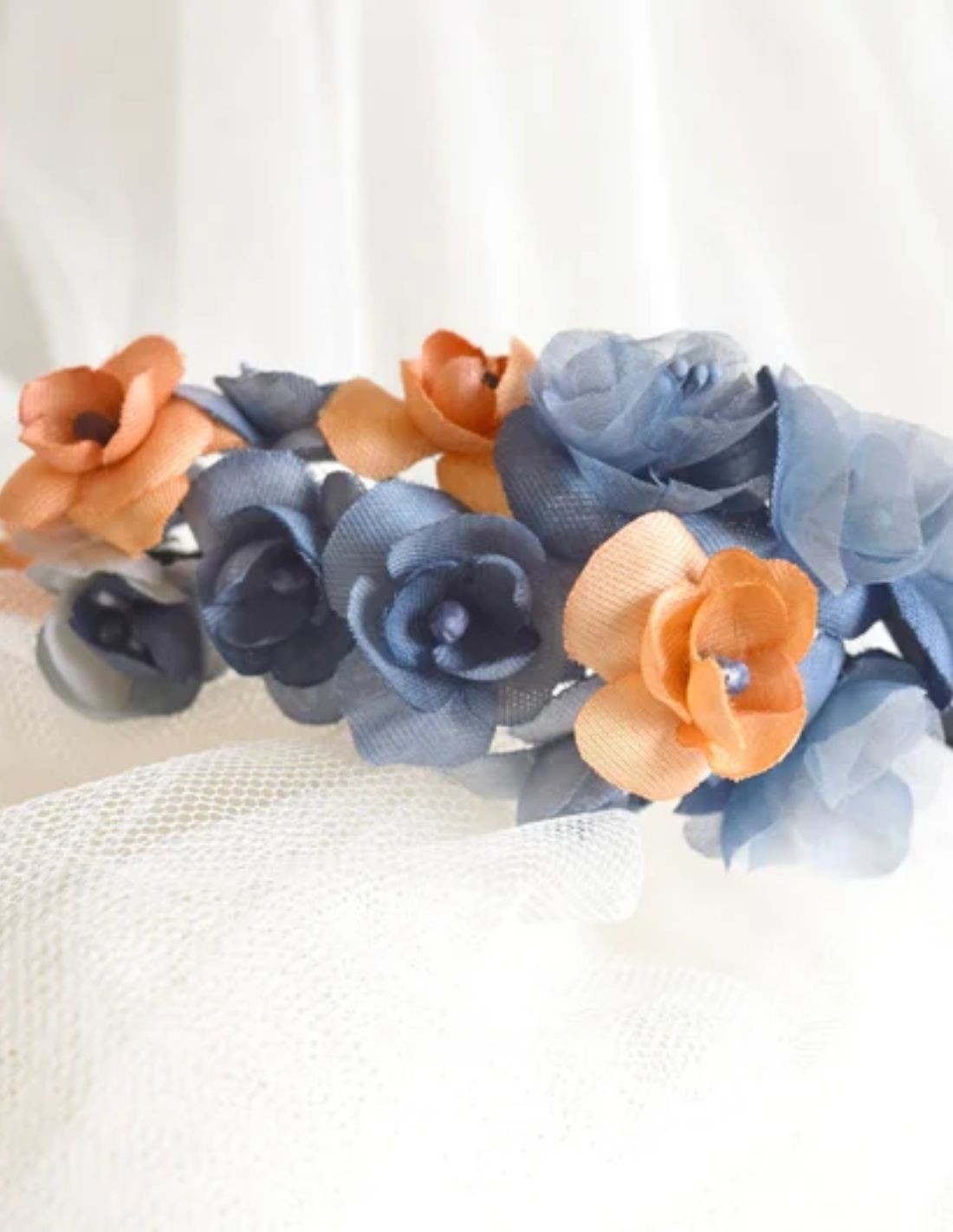 Diadema fina con florecitas azules y naranjas para ocasiones especiales.