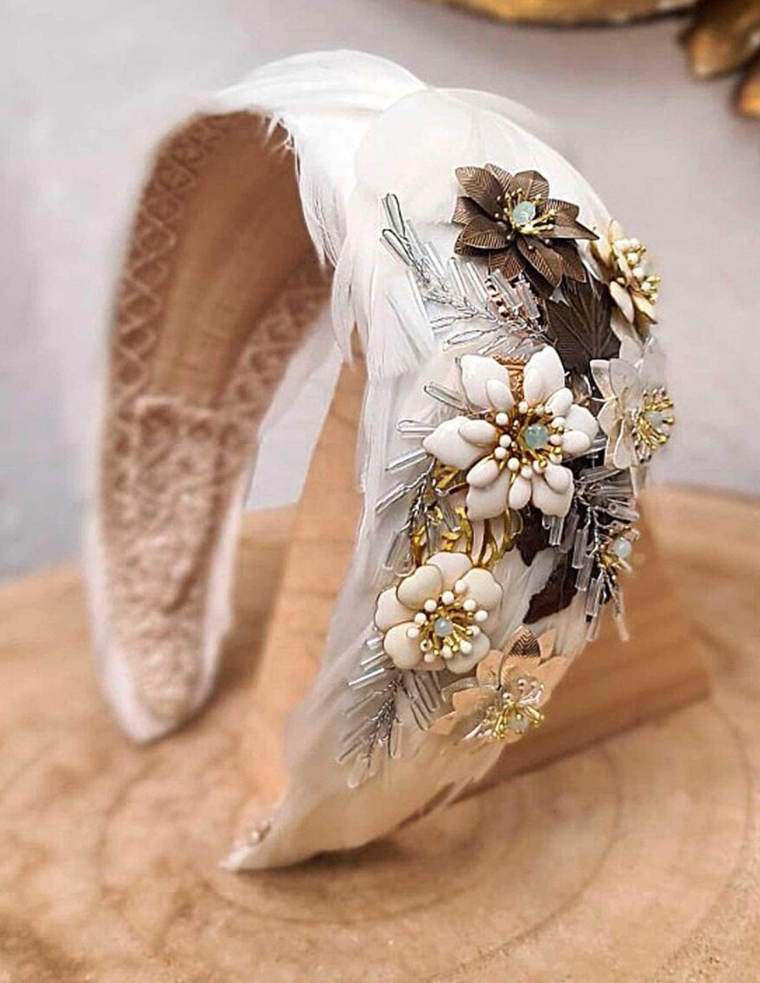Diadema para novias con plumas con decoración joya en bronce