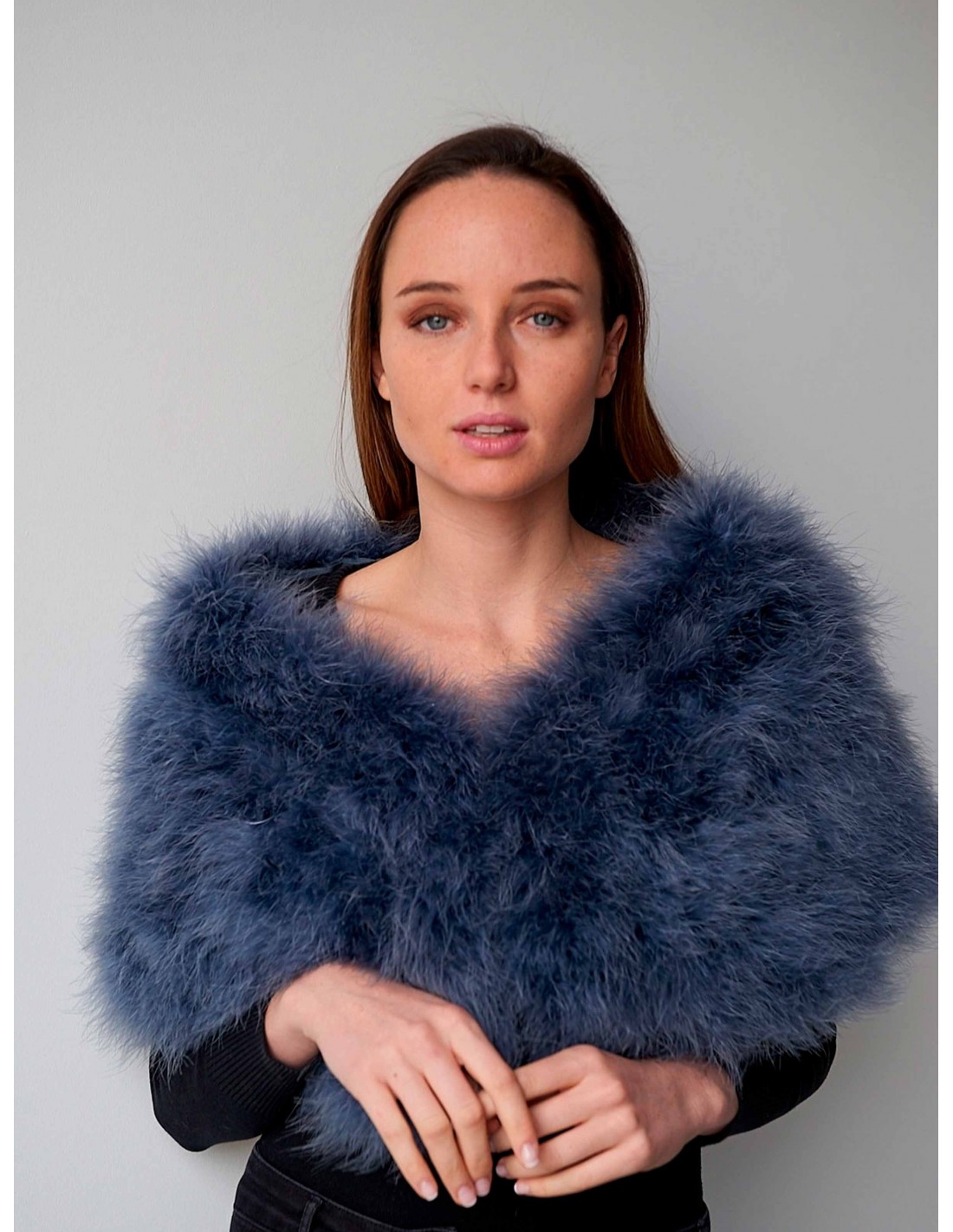 Preciosa Estola de fiesta larga de plumaje natural de avestruz en varios colores. Disponible en: azul tinta, beige y fucsia. Un complemento perfecto para lucir en ocasiones tan especiales como bodas, bautizos y comuniones.