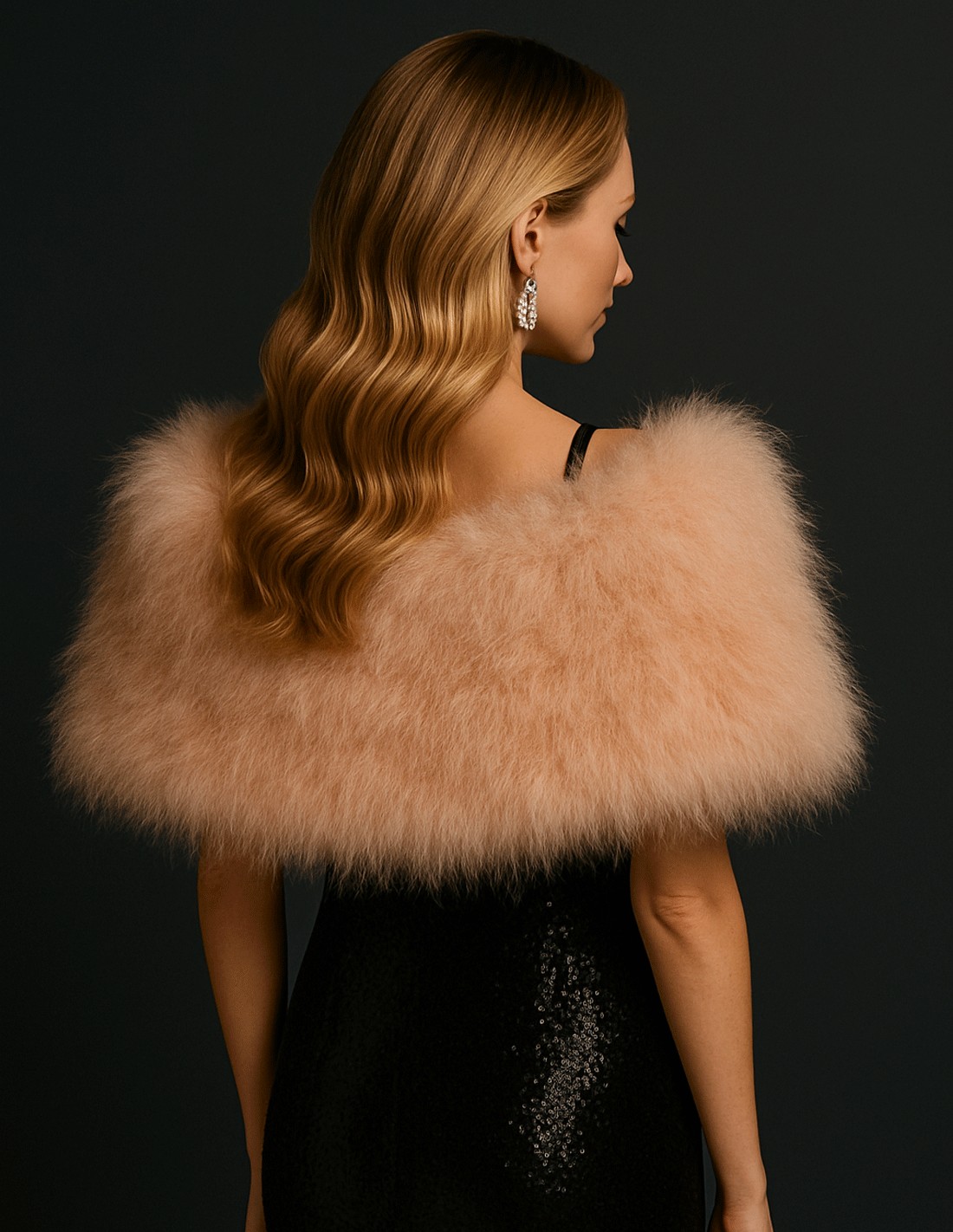 Estola de pluma de avestruz natural en color beige (teñido). Perfecto para acompañar a tus vestidos de fiesta, trajes y abrigos y darles un toque elegante y sofisticado tipo old hollywood.