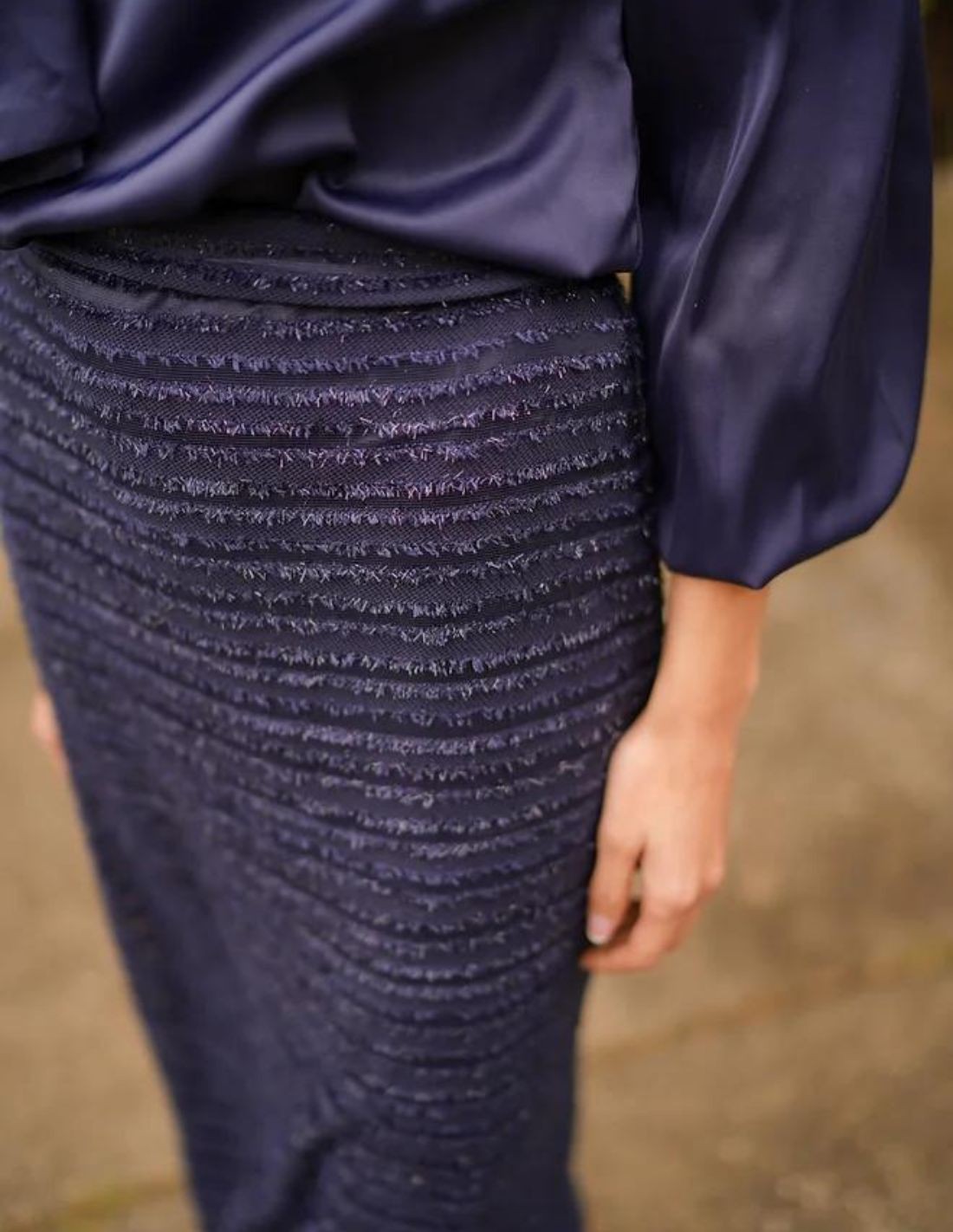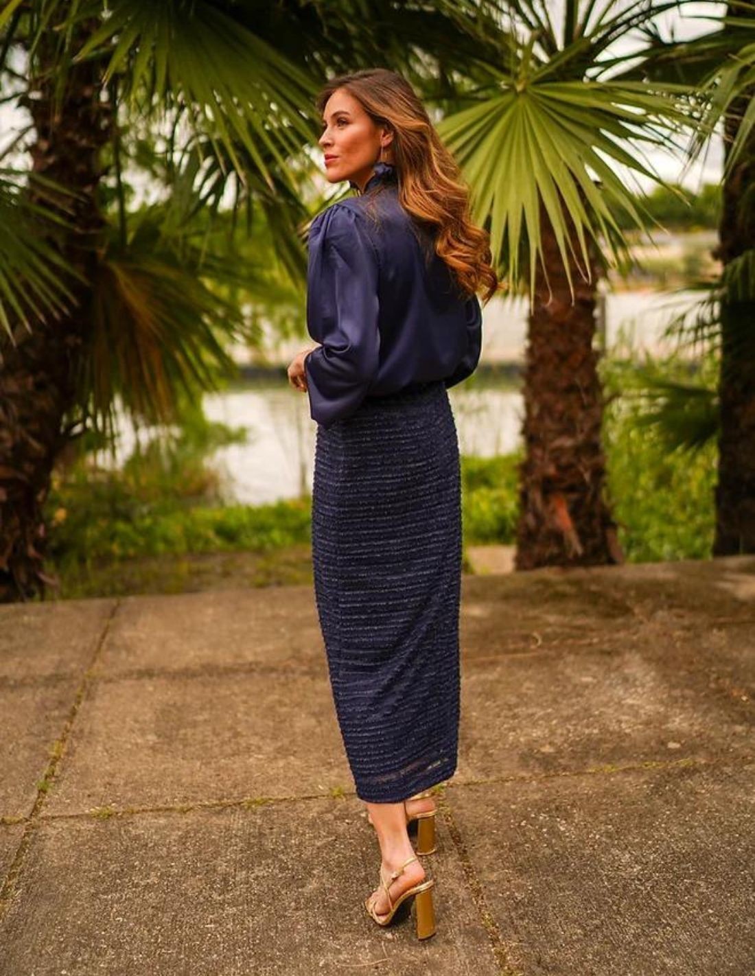 Combina la falda midi de punto color marino con la blusa marino con hombreras para conseguir un look elegante y versátil. Llévalo en bautizos, comuniones o en cualquier evento especial. Con un largo midi y tejido de forro de punto elástico perfecto para los eventos de otoño.