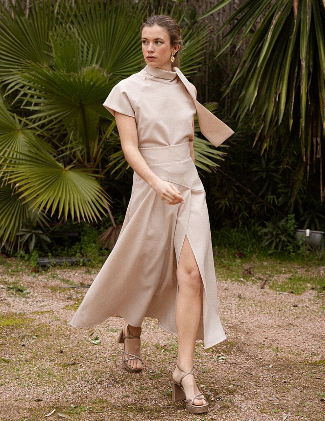 Falda midi de vuelo con tablas en color beige para invitada