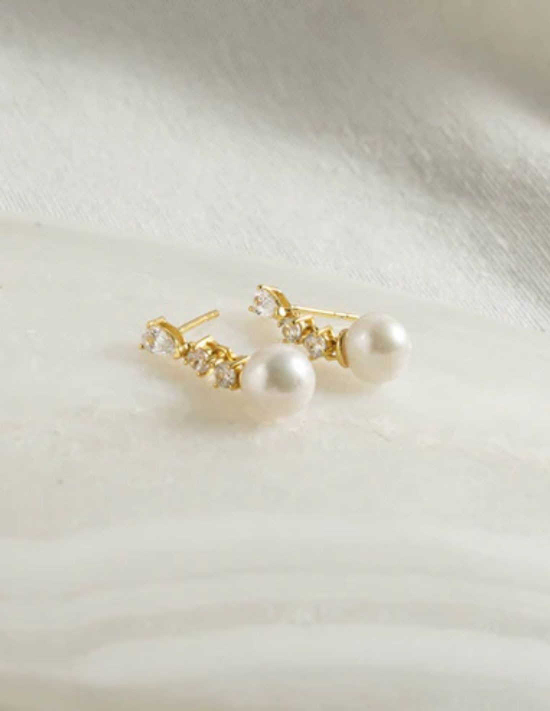 Pendientes finos con circonitas y perla final, un diseño minimalista y elegante en latón bañado en oro.