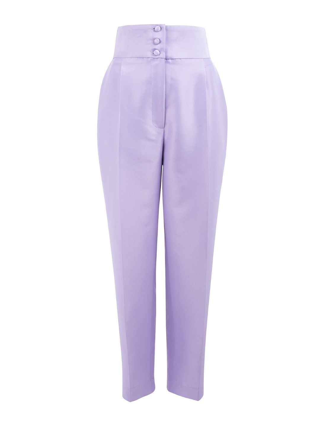 Este pantalón de invitada está realizado en un tejido de raso satinado color lila. Presenta un delantero con una cinturilla alta con botones forrados y cierre de cremallera invisible.