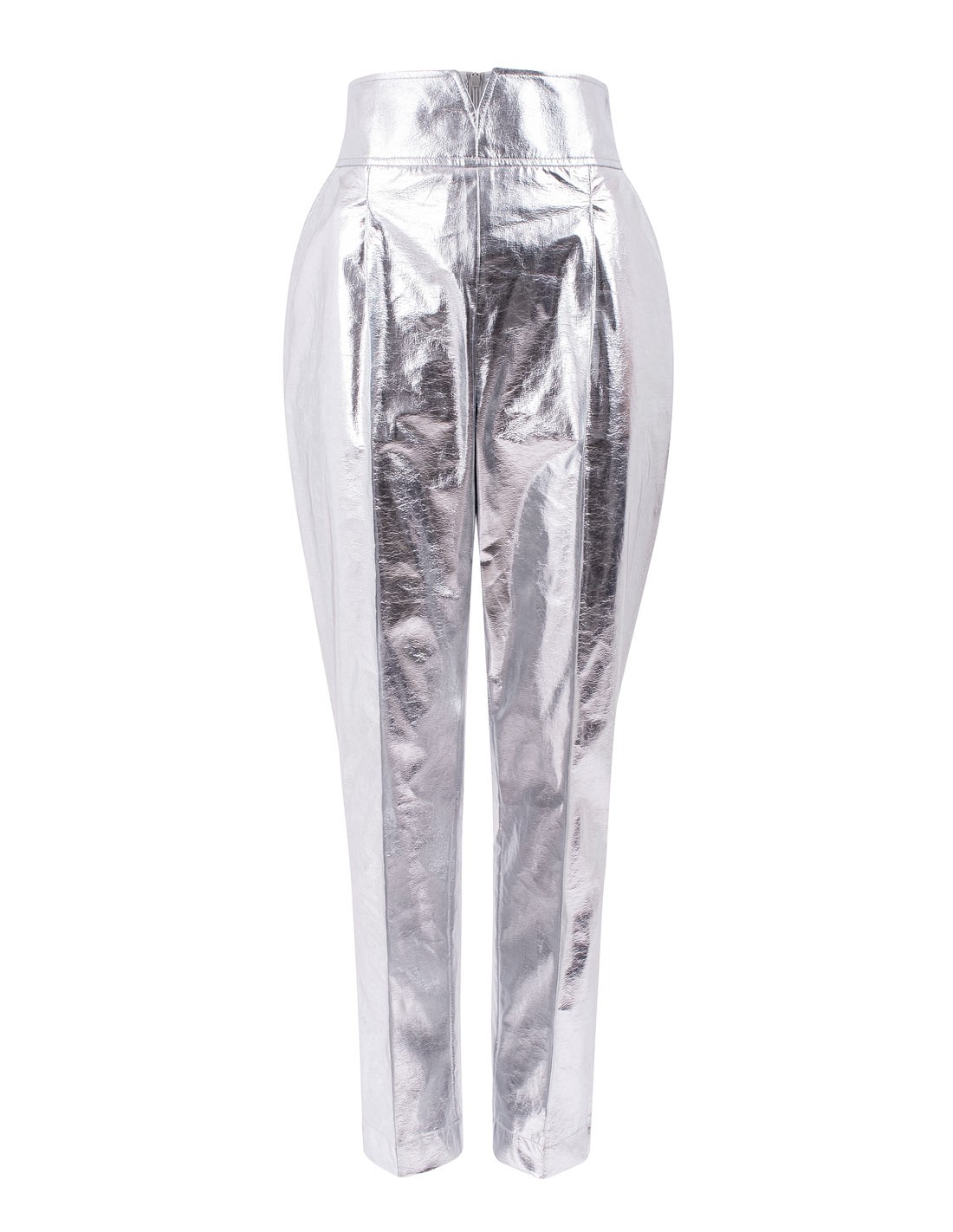 Increíble pantalón de fiesta confeccionado en un tejido metalizado siendo la gran tendencia de este año. Tiene cinturilla alta y ancha lo que ayudará a que visualmente se vea más pequeña tu cintura y tus piernas parecerán kilométricas. Se cierra con una cremallera invisible en la parte de atrás y tiene el efecto pinza en la pernera.