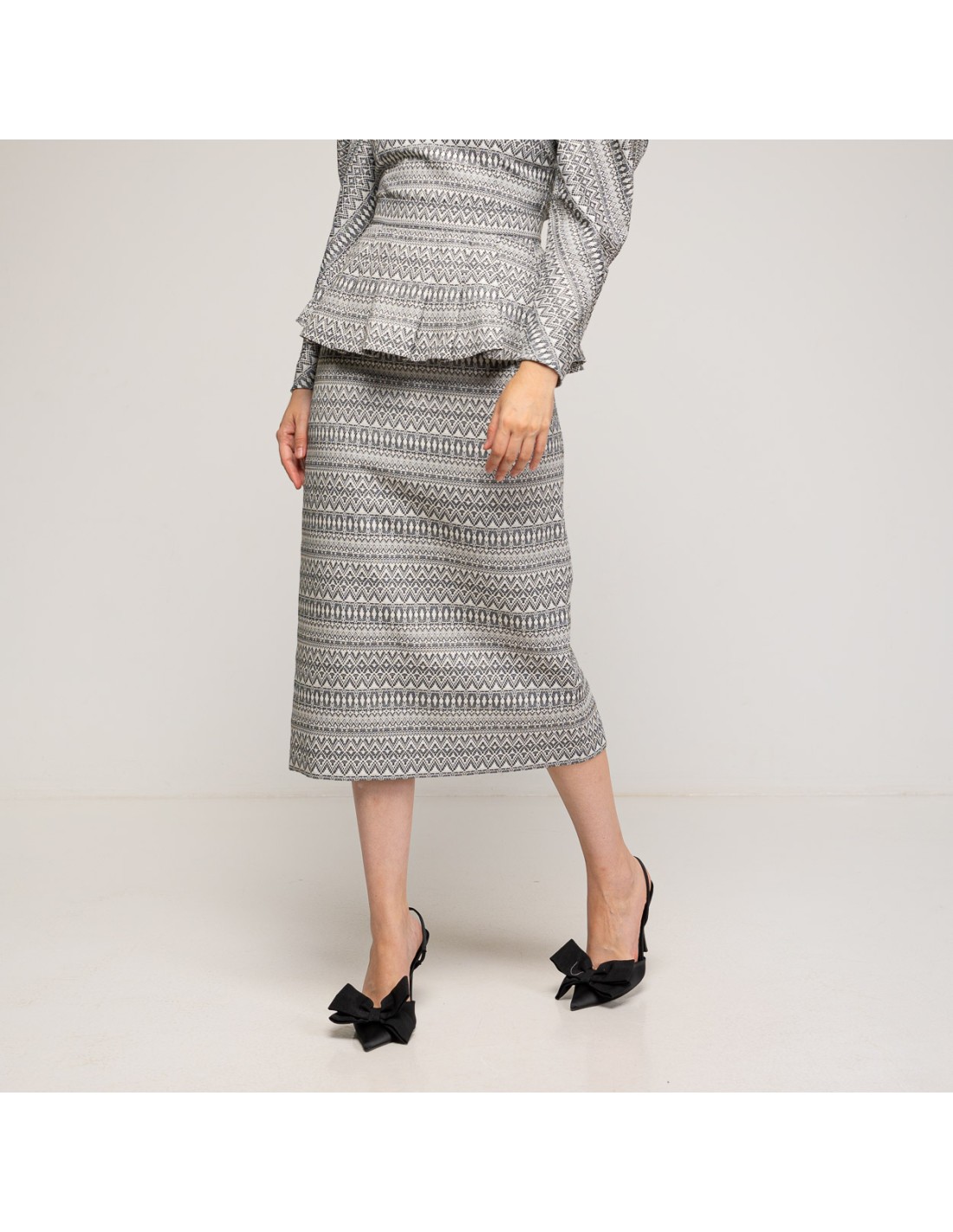Esta falda midi peplum en blanco y negro se convertirá en tu prenda favorita. Confeccionada en un tejido de alta calidad con peplum desmontable. Combínalo con el top del mismo tejido y haz un conjunto súper versátil y elegante para lucir en diferentes ocasiones junto y separado. Te encantará lucirlo en eventos más elegantes pero también en looks más casuales.