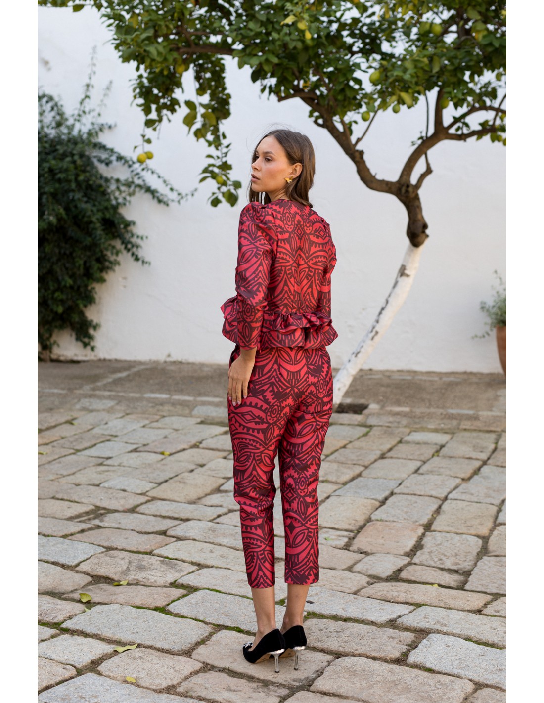Este pantalón recto para invitada con diseño estampado exclusivo lo tienes disponible en colores de temporada, rojo Scarlet Smile y burdeos Maroon. Este pantalón destaca por su estilo sofisticado y moderno, ideal para realzar cualquier look con un toque de elegancia y originalidad.