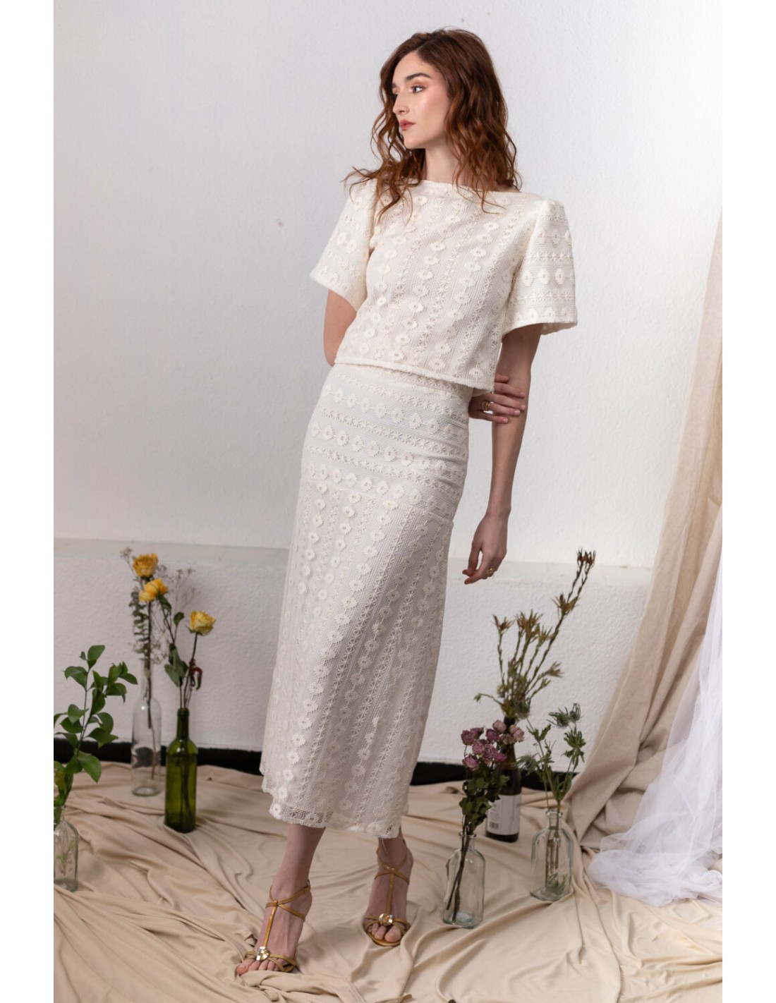 Descubre la elegancia atemporal de esta falda midi evasé en tejido de macramé, confeccionada en 100% algodón con forro interior de crepé para una caída suave y cómoda. Su diseño presenta una cintura ancha en la cadera que estiliza la figura y aporta un ajuste favorecedor, mientras que el corte evasé ofrece movimiento y ligereza con cada paso.