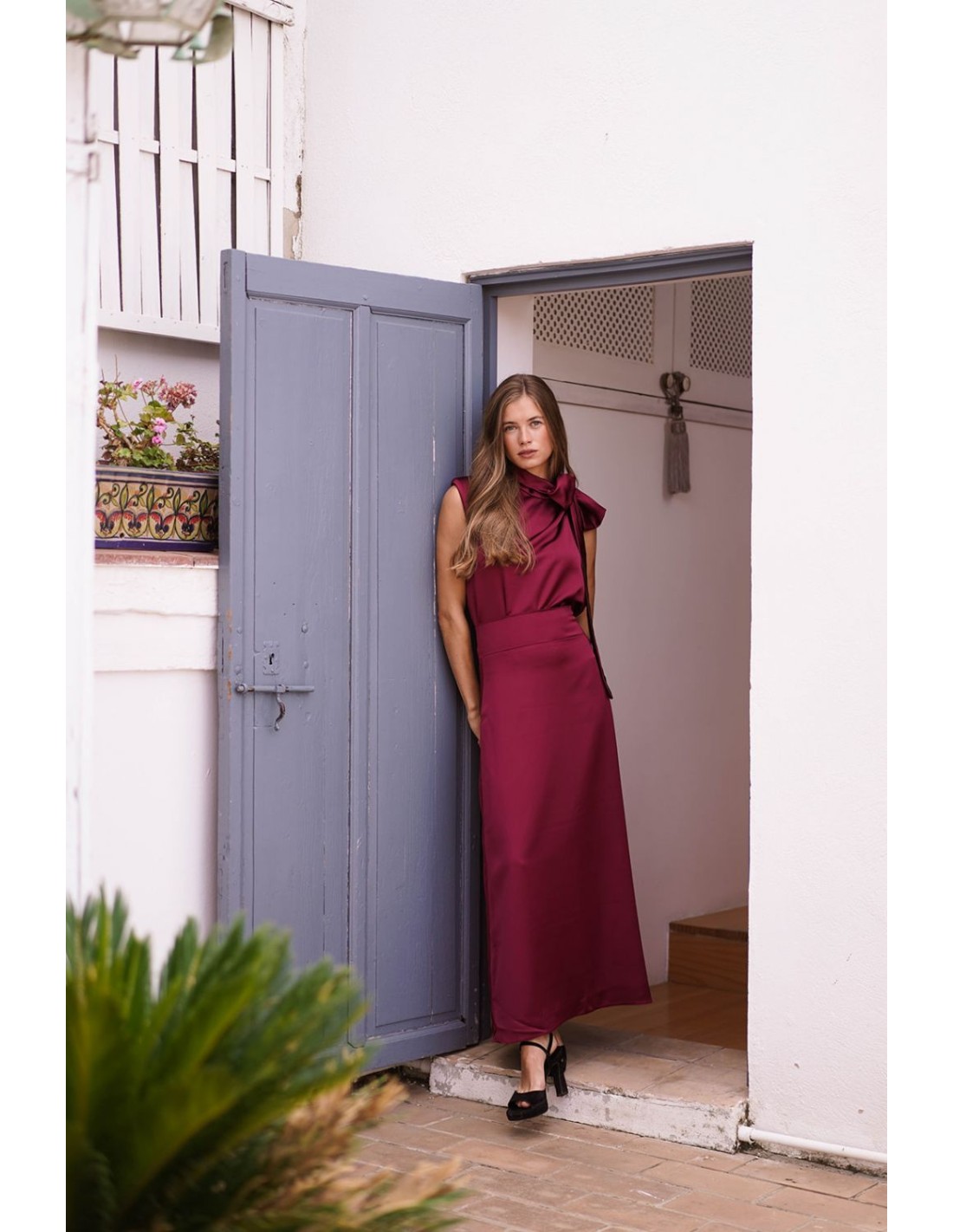 Destaca con esta falda midi evasé satinada en tono burdeos. Su tejido satinado aporta un toque de glamour a cualquier look. El corte evasé ofrece un movimiento fluido y favorece todo tipo de siluetas. Ideal para ocasiones especiales o para elevar tus outfits diarios con estilo.