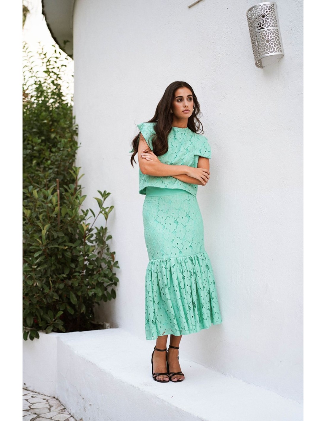 Esta falda midi de encaje verde turquesa es la elección perfecta para quienes buscan sofisticación con un toque romántico. Confeccionada en 100% algodón y forrada en crepé de poliéster, ofrece comodidad y una estructura impecable. Su diseño incluye un volante en el bajo que aporta movimiento y feminidad, ideal para ocasiones especiales o looks de invitada con personalidad.