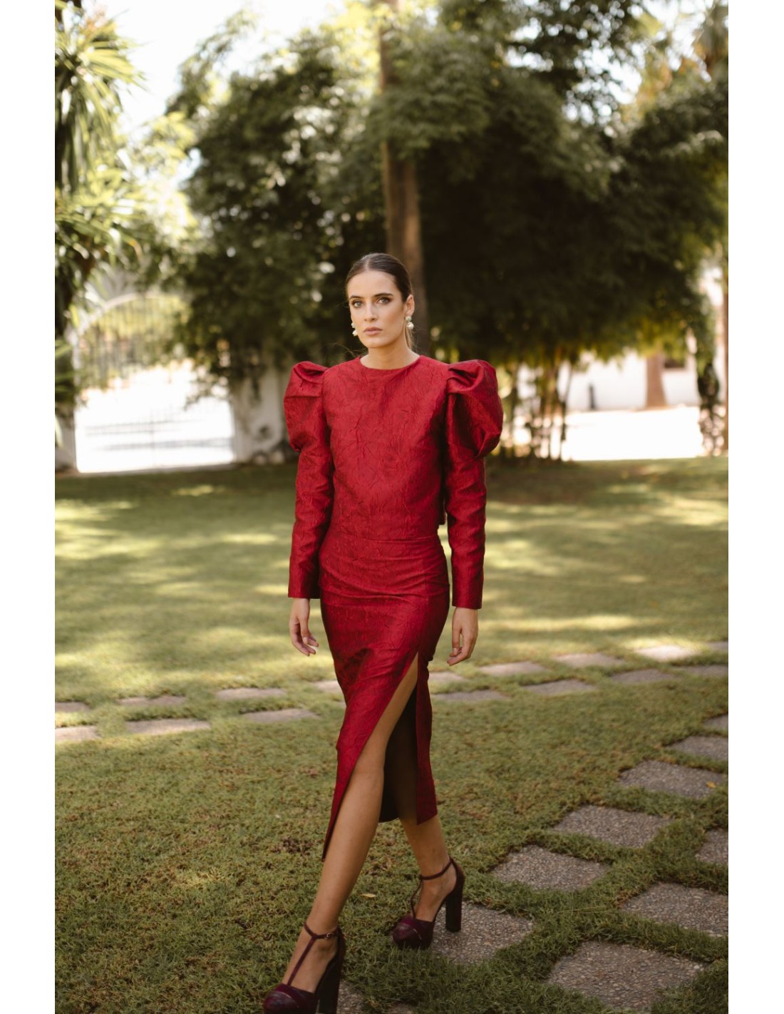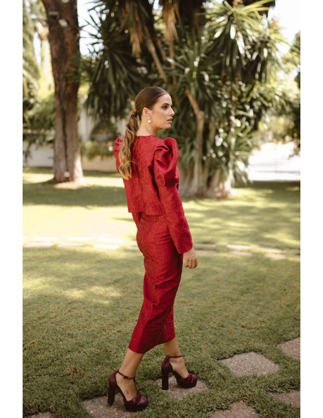 Si tu idea es lucir un conjunto en tu próximo evento de primavera/verano, esta falda midi de invitada junto a su top, ¡te harán brillar! Confeccionado en tejido brocado de flores color burdeos. Ideal y elegante para esta temporada, ademas podrás lucir sus prendas por separado para crear otros diferentes looks. La falda incorpora una abertura infinita en un lado que la hace super femenina y cómoda.