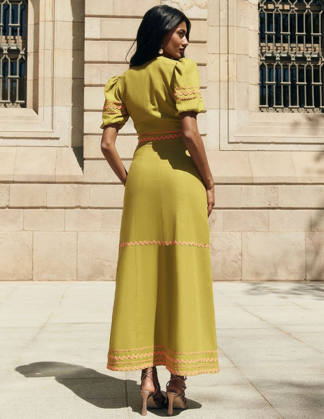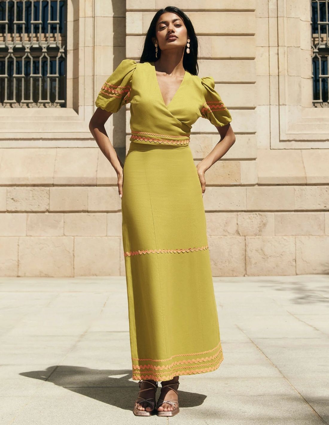 Si aún no tienes look para tu próximo evento de verano, esta falda midi de fiesta en verde oliva, es la ideal para ir cómoda y elegante a cualquier boda de día, graduación, bautizo o comunión. Confeccionada en lino y viscosa de alta calidad, con una caída fluida y cintas decorativas onduladas en un tono naranja incorporadas en la cadera, a media pierna y en el bajo de la falda. Si quieres elevar tu look, puedes combinarla con el top verde oliva que combina la falda y completa el conjunto.
