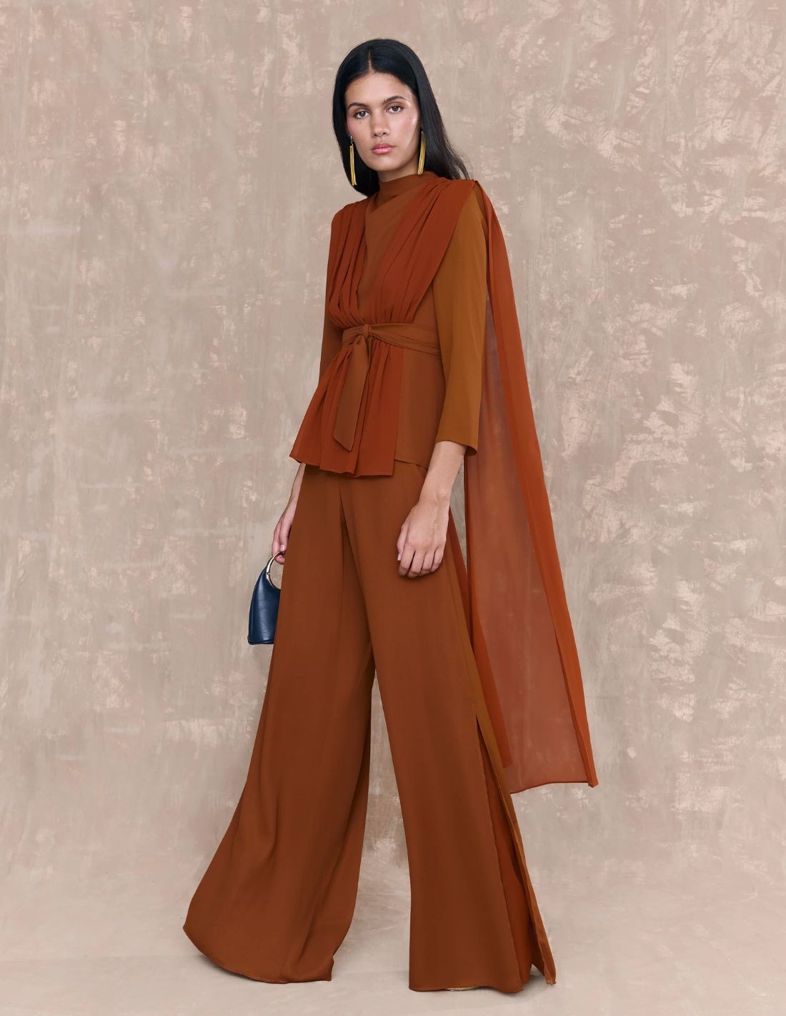 Si tienes un evento de otoño-invierno y quieres ser la invitada mejor vestida, este pantalón marrón combinado con su blusa que completa el set es la opción ideal. Un pantalón con diseño de pata de elefante en color marrón, confeccionado en georgette de alta calidad y con forro interior en gasa del mismo tono. De tiro alto, con cremallera trasera invisible.