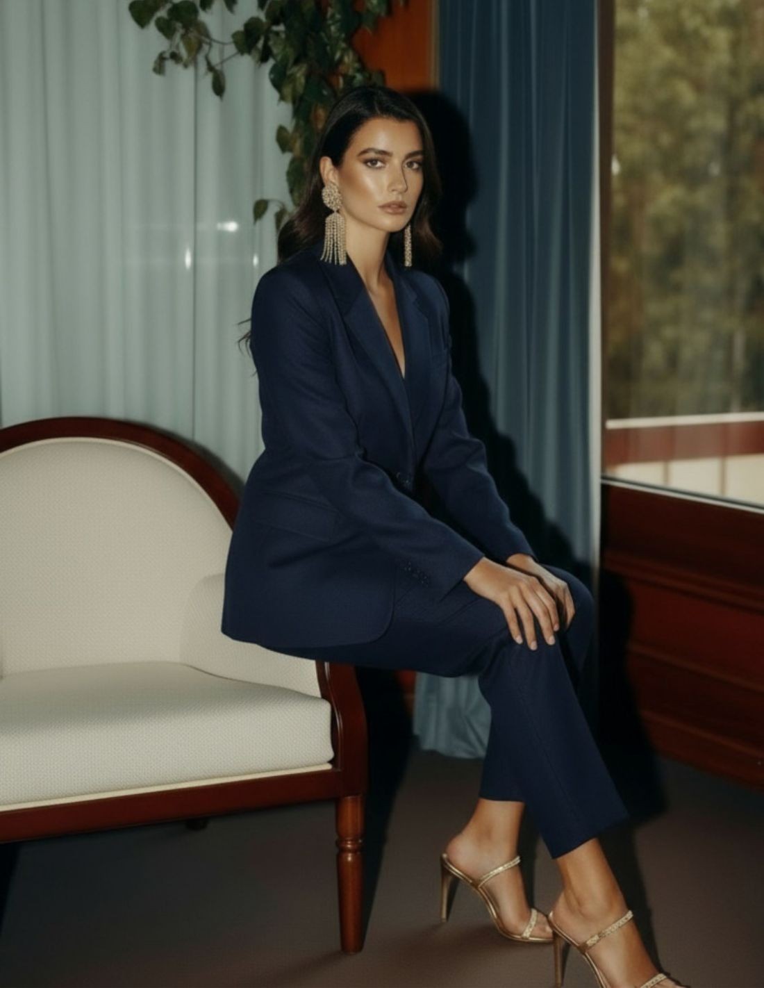 Si buscas la prenda estrella de tu armario, este pantalón largo estructurado, ¡será tu aliado! Se convertirá en tu favorito y no querrás quitártelo. Podáas combinarlo para eventos más elegantes pero también para planes más casuales. Un diseño sofisticado que podrás combinar a la perfección con todo tipo de partes de arriba, gracias a su color azul marino. Este pantalón forma parte de un traje de dos piezas con chaqueta del mismo color.