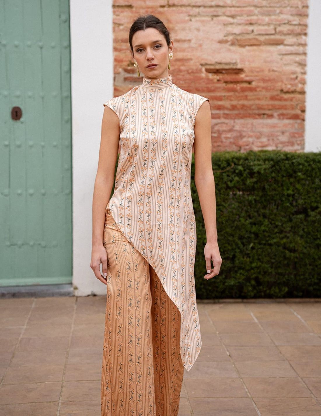 Pantalón fluido en tono amarillo tostado con rayas verticales y delicado estampado floral que estiliza la silueta. Ligero, cómodo y elegante, perfecto para looks versátiles con un toque sofisticado.