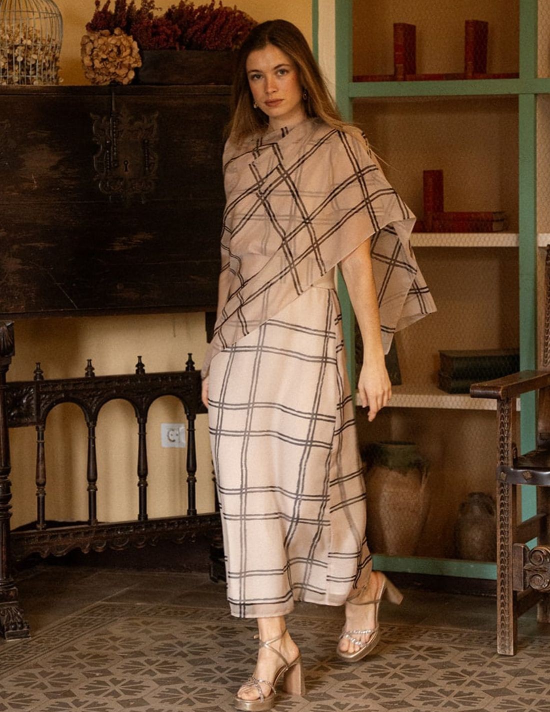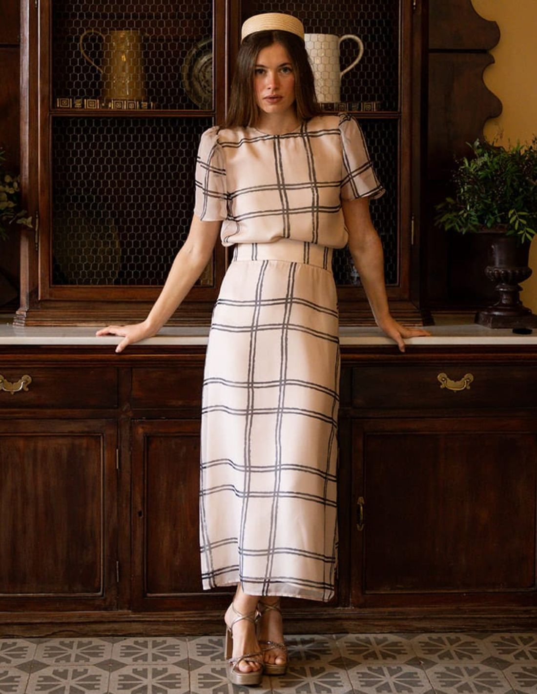 Falda midi evasé confeccionada en ligera gasa, con un elegante estampado de cuadros que aporta un aire atemporal y sofisticado. Su silueta fluida y su delicado movimiento acompañan cada paso, realzando la figura con naturalidad y elegancia.