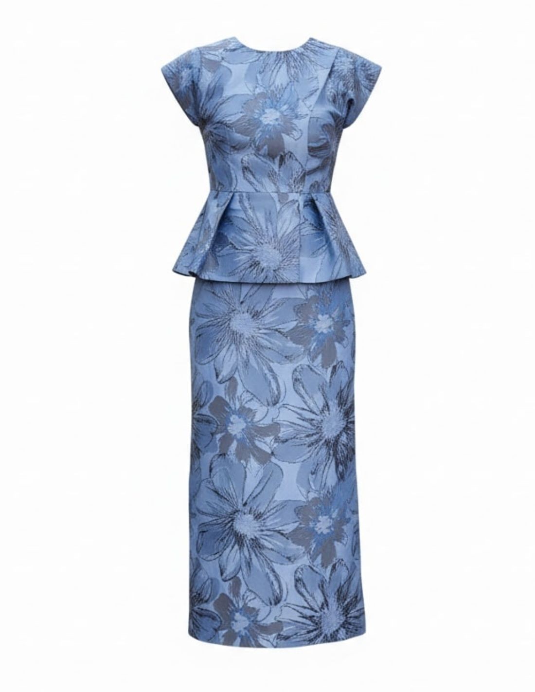 Esta falda midi se convertirá en una pieza indispensable de tu armario. Confeccionada en un tejido brocado color azul con estampado floral. Si lo luces con su top a conjunto, tendrás un dos piezas ideal para eventos o incluso para lucir por separado de manera más casual. Su corte recto estiliza mucho la figura y además, incluye abertura trasera que aporta comodidad y un toque sutil.